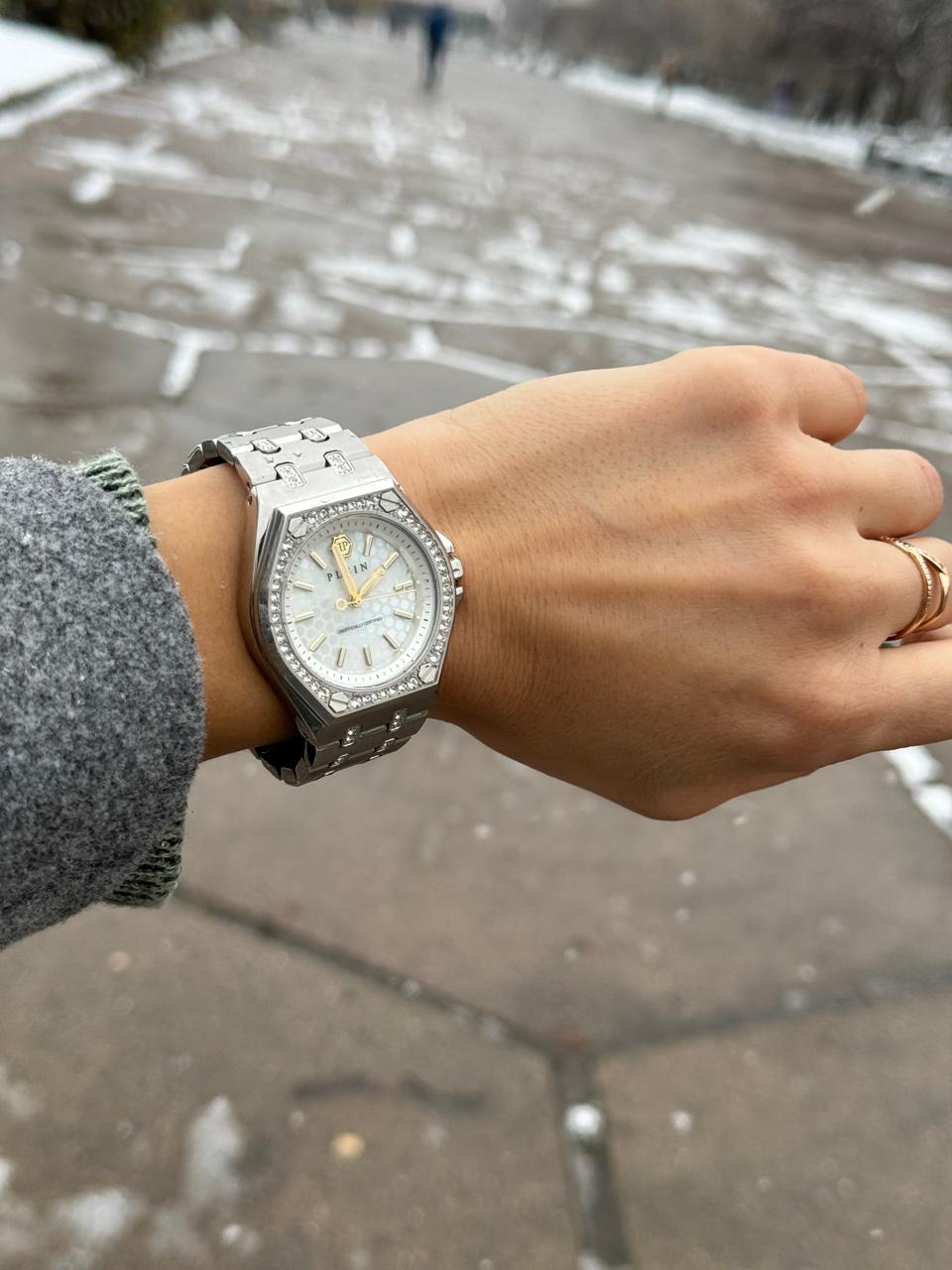 Женкие кварцевые часы Philipp Plein Extreme PWJAA1123. Корпус часов изготовлен из нержавеющей стали. Минеральное стеклоМинеральное стеклоМинеральное стекло представляет собой искусственно выращенный минерал кварца. Такое стекло отличается особой устойчивостью к повреждениям и царапинам. Уступает по некоторым качествам сапфировому стеклу. устойчивое к мелким механическим повреждениям. Стальной браслет на застёжке-бабочке с кнопкамиЗастёжка "бабочка"Такой вид застёжки дополняется предохранителями, помогающими избежать случайного раскрытия браслета. Обладают изящным исполнением. . Влагозащита: 50 метров, позволит защитить корпус от случайных брызг или капель дождя. Стрелки и метки с люминесцентным покрытиемЛюминесцентное покрытиеПозволяет считывать показания времени в темноте. Производители наносят на стрелки, часовые индексы, безель или поверхность циферблата светонакопительный состав, дающий холодное свечение.. Практичный ремешок из силикона на стандартной застёжке. БезельБезельВнешний ободок, закрепляющий стекло. В спортивных часах так называется поворотное кольцо с делениями на циферблате, выполняет роль таймера – замеряет отрезки времени на шкале. Неподвижный безель – элемент декора. Однонаправленно вращающийся безель на дайверских часах позволяет фиксировать моменты погружения и выныривания на поверхность. и браслет инкрустированы цветными кристаллами Preciosa.