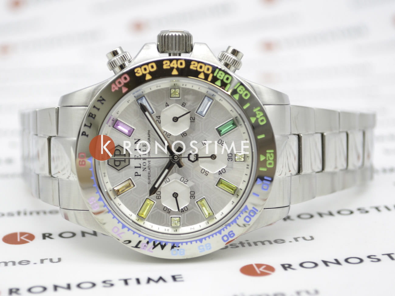 Яркие женские часы-хронографХронографФункция позволяет измерять отрезки времени с особой точностью: часы, минуты, секунды. Верным признаком хронографа является наличие на циферблате 3 дополнительных окошек-счётчиков. с секундомеромСекундомерСекундоме́р — прибор, способный измерять интервалы времени с точностью до долей секунды. Philipp Plein Nobile Lady PWSBA0123, кварцевый механизм с высокой точностью. 12 и 24-часовой формат времени. Класс водозащиты: 50 метров, позволит защитить корпус от случайных брызг или капель дождя. Корпус и браслет часов изготовлены из нержавеющей стали. Стрелки с люминесцентным покрытиемЛюминесцентное покрытиеПозволяет считывать показания времени в темноте. Производители наносят на стрелки, часовые индексы, безель или поверхность циферблата светонакопительный состав, дающий холодное свечение.. Стальной браслет на застёжке-бабочке с кнопкамиЗастёжка "бабочка"Такой вид застёжки дополняется предохранителями, помогающими избежать случайного раскрытия браслета. Обладают изящным исполнением. . Циферблат инкрустирован кристаллами Preciosa.