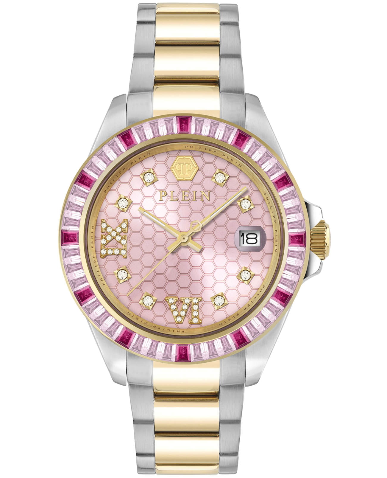 Женские кварцевые часы Philipp Plein Lady Empire PW2FA0325 — это стильное сочетание элегантности и современного дизайна. Изящный корпус выполнен из нержавеющей стали, диаметром 39 мм, что придаст образу женственности и романтизма. Изысканный циферблат с метками в виде точек и римских цифр придает модели особый блеск. Циферблат защищен минеральным стекломМинеральное стеклоМинеральное стекло представляет собой искусственно выращенный минерал кварца. Такое стекло отличается особой устойчивостью к повреждениям и царапинам. Уступает по некоторым качествам сапфировому стеклу., обеспечивающий устойчивость к царапинам и украшен кристаллами. Стрелки с люминесцентным покрытиемЛюминесцентное покрытиеПозволяет считывать показания времени в темноте. Производители наносят на стрелки, часовые индексы, безель или поверхность циферблата светонакопительный состав, дающий холодное свечение.. Окошко даты находится в положении 3 часа. БезельБезельВнешний ободок, закрепляющий стекло. В спортивных часах так называется поворотное кольцо с делениями на циферблате, выполняет роль таймера – замеряет отрезки времени на шкале. Неподвижный безель – элемент декора. Однонаправленно вращающийся безель на дайверских часах позволяет фиксировать моменты погружения и выныривания на поверхность. с PVD-покрытиемPVDУльтратонкое покрытие наносится в технике вакуумного напыления, сочетает в себе нитрид титана особой прочности со слоем золота или оксида хрома. Несёт в себе декоративную или защитную функцию. украшен цирконами. Часы оснащены надежным кварцевым механизмом. Стальной браслет с частичным PVD-покрытиемPVDУльтратонкое покрытие наносится в технике вакуумного напыления, сочетает в себе нитрид титана особой прочности со слоем золота или оксида хрома. Несёт в себе декоративную или защитную функцию. на застёжке-бабочке с кнопкамиЗастёжка "бабочка"Такой вид застёжки дополняется предохранителями, помогающими избежать случайного раскрытия браслета. Обладают изящным исполнением. , гарантирует комфортное и безопасное ношение. Класс водозащиты: 50 метров позволит защитить корпус от случайных брызг или капель дождя. Phlipp Plein — отличный выбор для тех, кто ценит яркость и качество.
