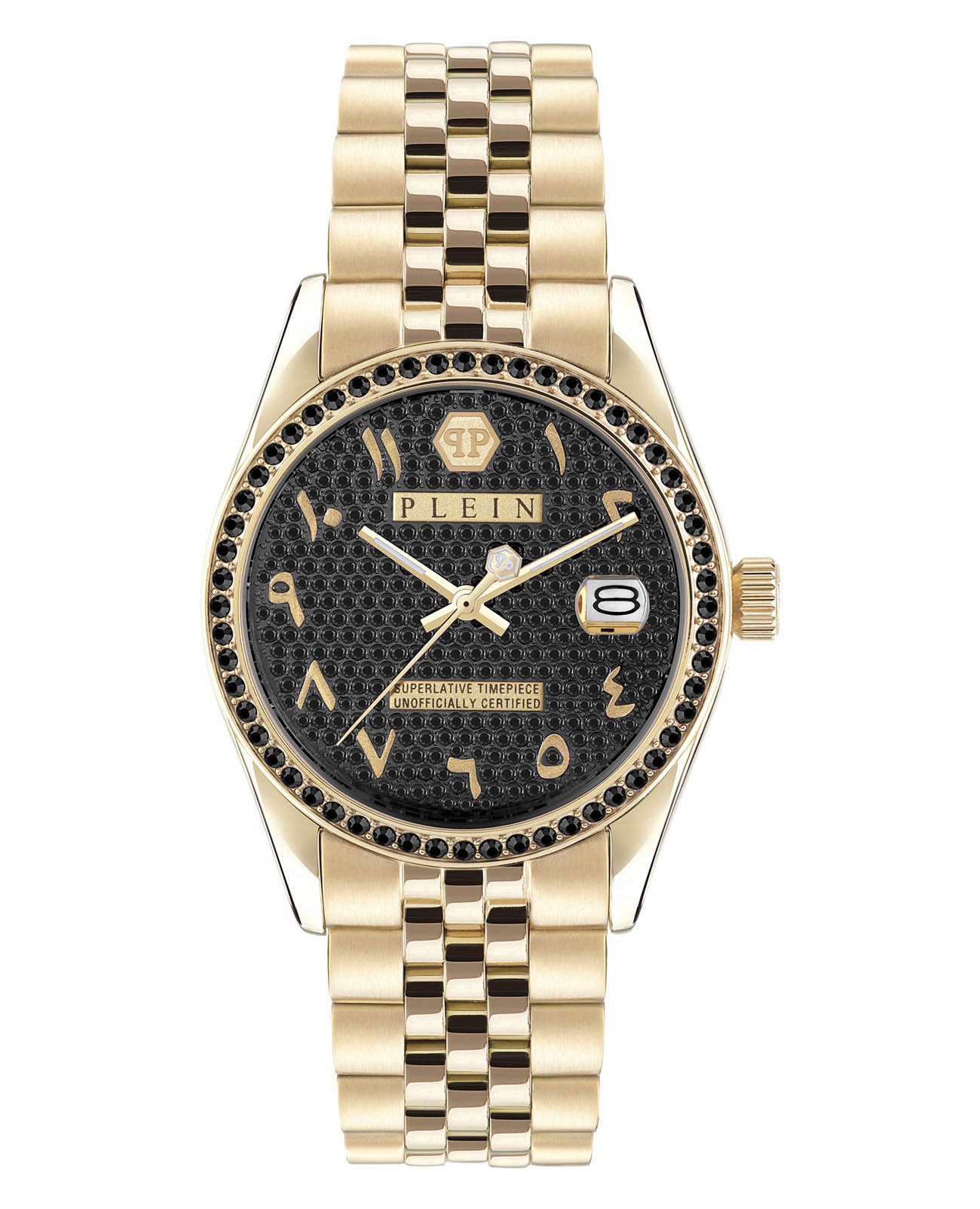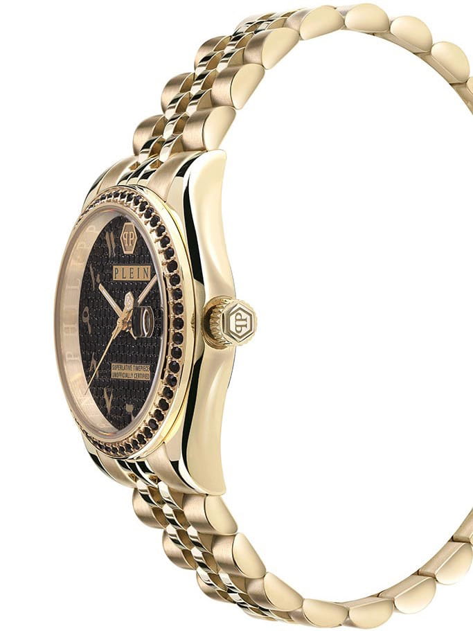 Яркие женские часы  Philipp Plein Date Superlative PWYAA0923 с минеральным стекломМинеральное стеклоМинеральное стекло представляет собой искусственно выращенный минерал кварца. Такое стекло отличается особой устойчивостью к повреждениям и царапинам. Уступает по некоторым качествам сапфировому стеклу.. Особенные часы для особенных женщин! Ослепительный аксессуар, демонстрирующий роскошь и изысканность.Часы с круглым стальным корпусом с IP-покрытиемIP-покрытиеМетод ионного напыления. Демонстрирует повышенную устойчивость к истиранию, окислению и химическим веществам. Под воздействием высокого давления и температуры около 1500°C молекулы металла надёжно соединяются с частицами корпуса часов.. Перламутровый циферблат с метками в виде точек, украшенных кристаллами. Люминесцентное покрытиеЛюминесцентное покрытиеПозволяет считывать показания времени в темноте. Производители наносят на стрелки, часовые индексы, безель или поверхность циферблата светонакопительный состав, дающий холодное свечение. стрелок. Окошко даты с увеличительным стеклом находится в положении 3 часа. Рифленая заводная головка. Стальной браслет на застёжке бабочка с кнопкамиЗастёжка "бабочка"Такой вид застёжки дополняется предохранителями, помогающими избежать случайного раскрытия браслета. Обладают изящным исполнением.