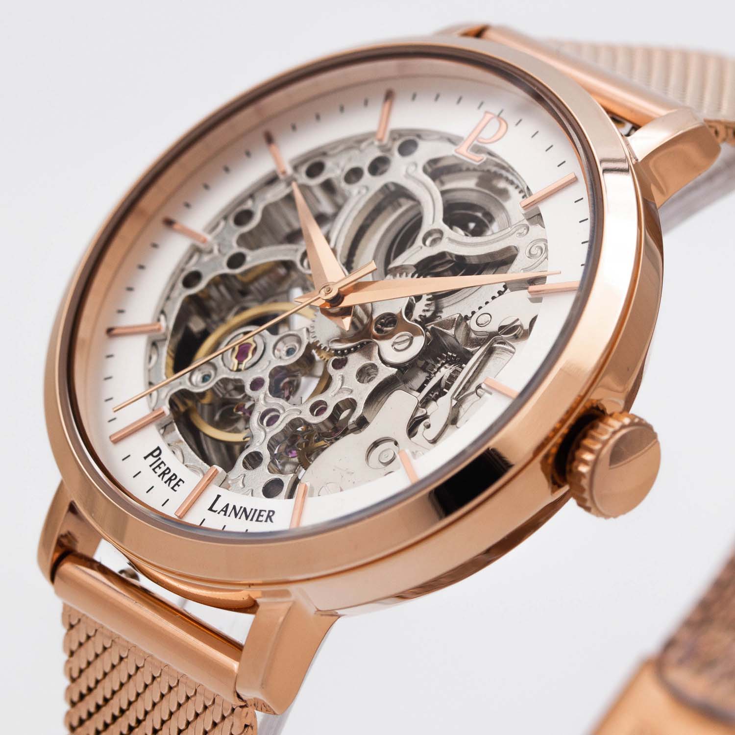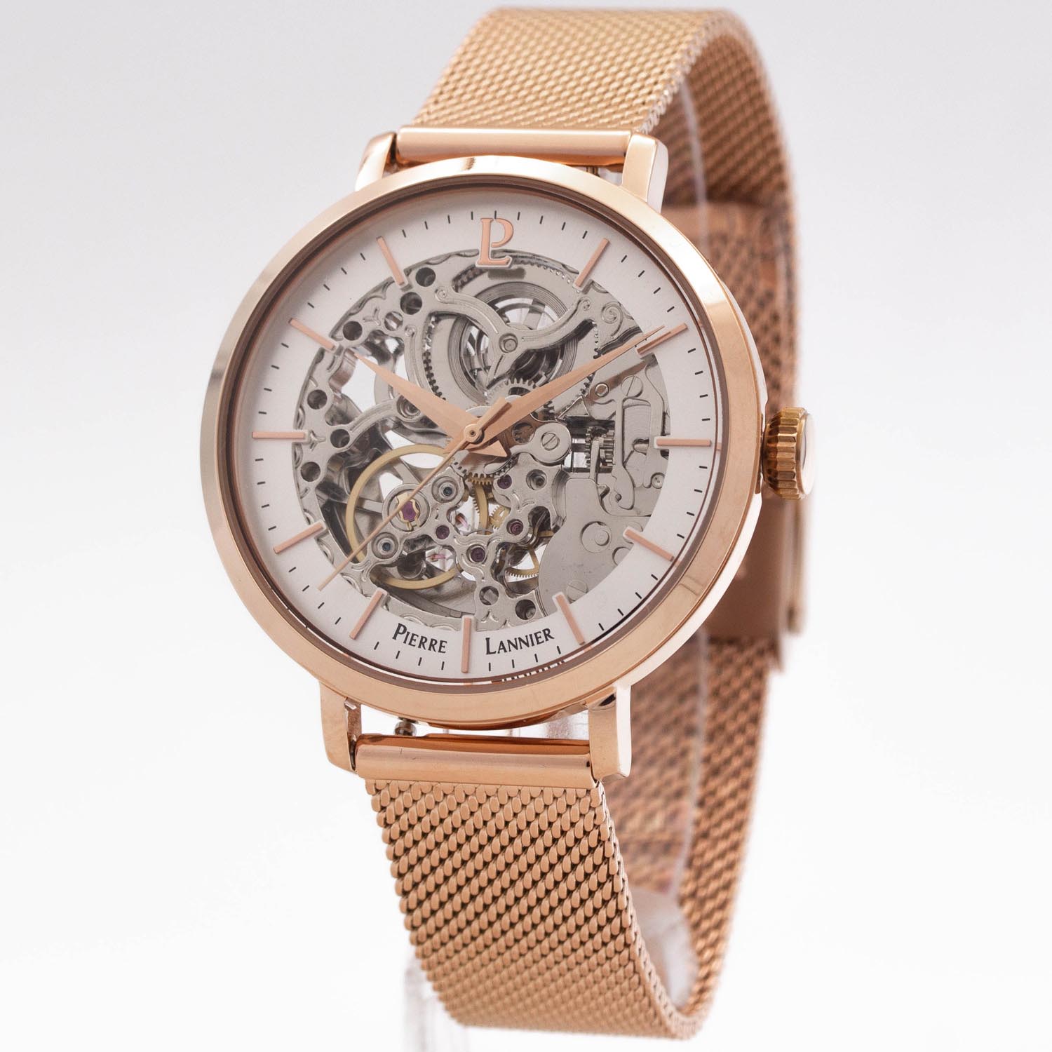Женские механические часы с автоподзаводом Pierre Lannier Automatic 309D928. Минеральное стеклоМинеральное стеклоМинеральное стекло представляет собой искусственно выращенный минерал кварца. Такое стекло отличается особой устойчивостью к повреждениям и царапинам. Уступает по некоторым качествам сапфировому стеклу. устойчивое к мелким механическим повреждениям. Центральные часовая, минутная и секундная стрелки. Корпус и браслет выполнен из нержавеющей стали с IP-покрытиемIP-покрытиеМетод ионного напыления. Демонстрирует повышенную устойчивость к истиранию, окислению и химическим веществам. Под воздействием высокого давления и температуры около 1500°C молекулы металла надёжно соединяются с частицами корпуса часов.. Водостойкость: 30 метров, позволит защитить корпус от случайных брызг или капель дождя. Браслет миланского плетения шириной 16 мм с раскладной застёжкойРаскладная застёжкаТакой тип застёжки используется только на браслетах из металла. Она никогда не раскрывается полностью, происходит разделение на 2 и более частей. Раскладывающая застёжка снизит вероятность потери часов к минимуму..