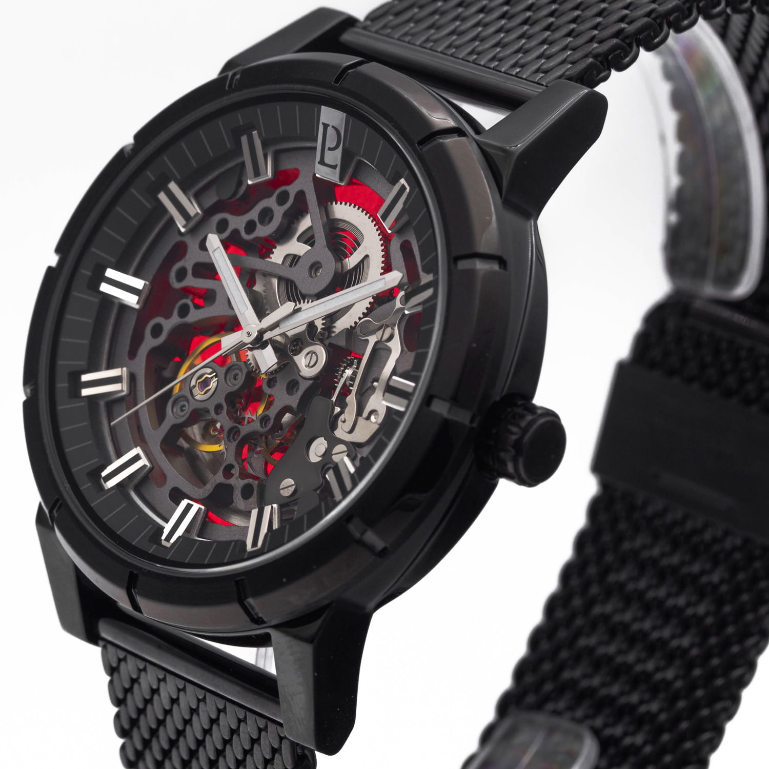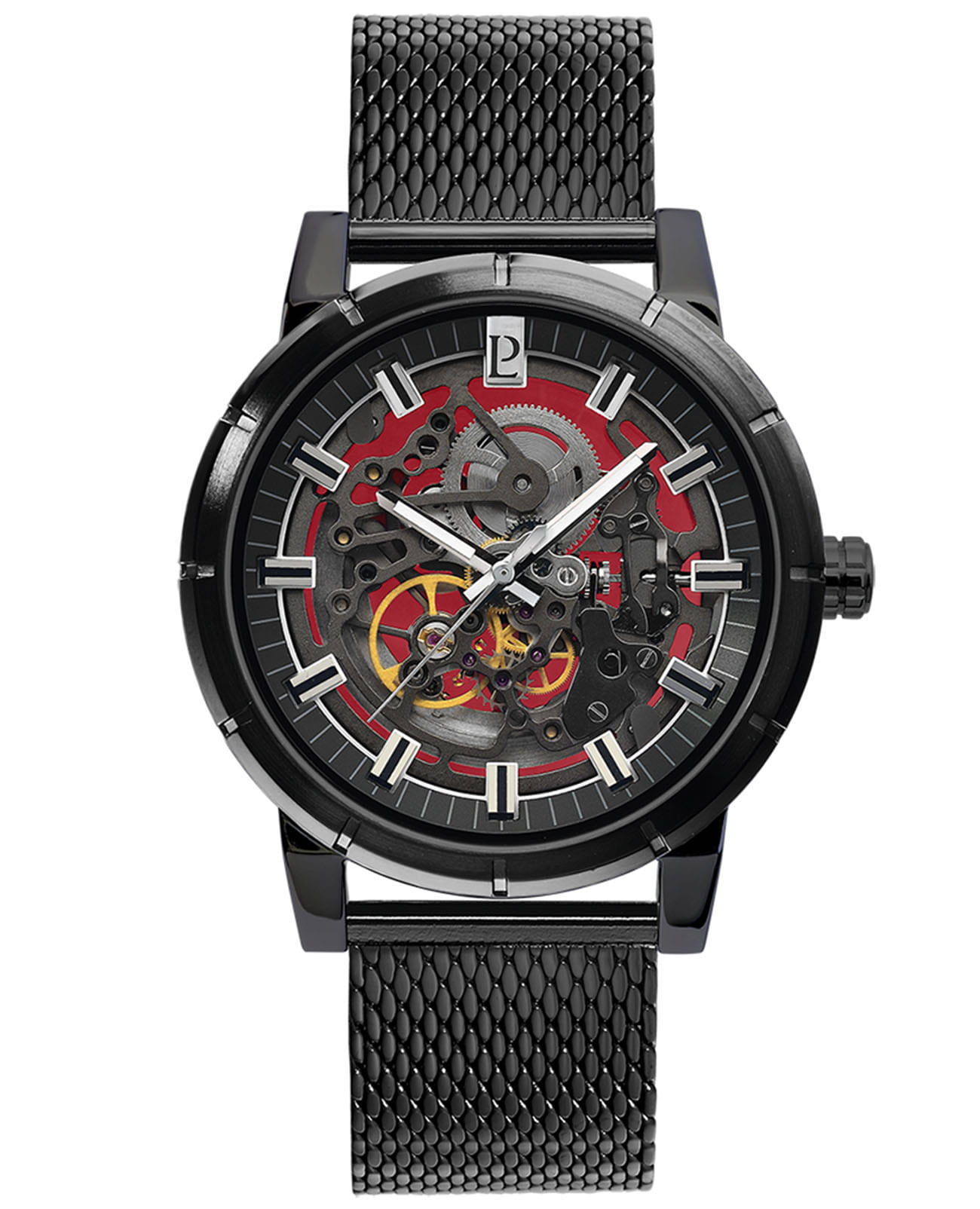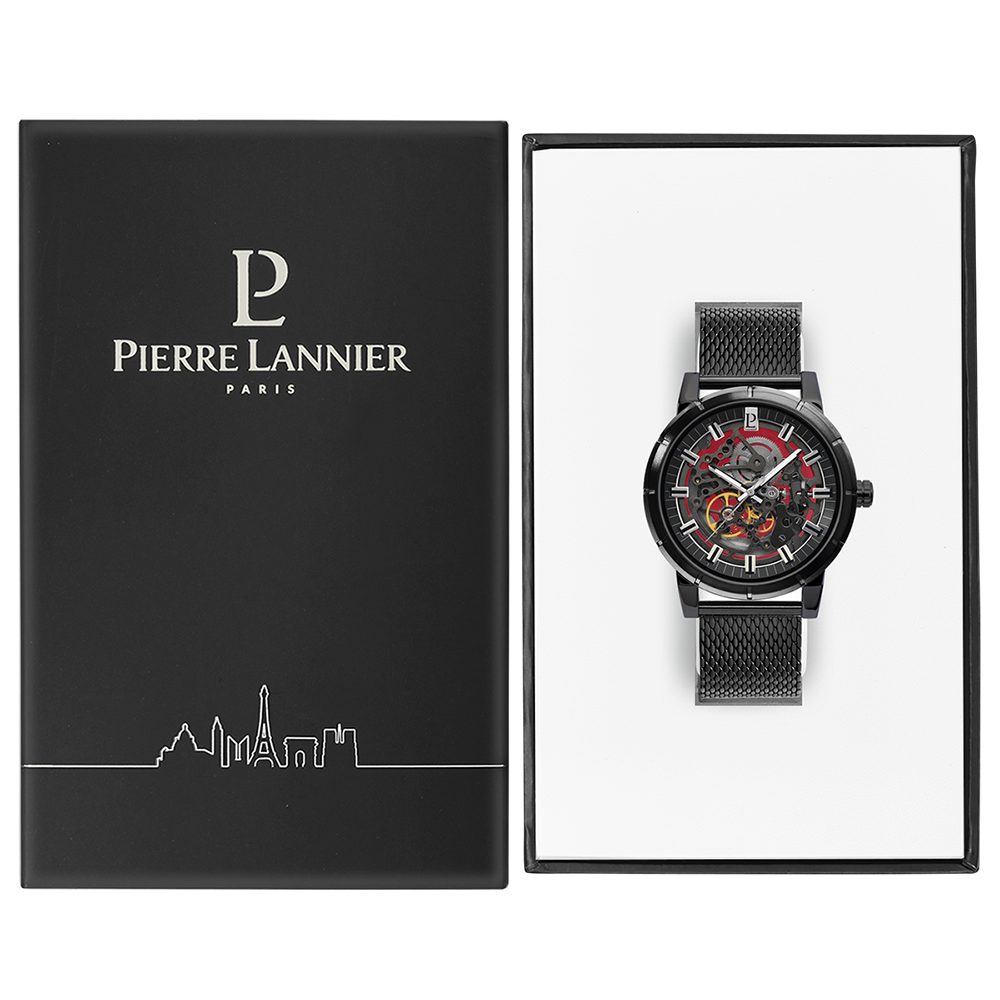 Мужские механические часы с автоподзаводом Pierre Lannier Automatic 321C438. Минеральное стеклоМинеральное стеклоМинеральное стекло представляет собой искусственно выращенный минерал кварца. Такое стекло отличается особой устойчивостью к повреждениям и царапинам. Уступает по некоторым качествам сапфировому стеклу. устойчивое к мелким механическим повреждениям. Центральные часовая, минутная и секундная стрелки. Корпус и браслет выполнены из нержавеющей стали с IP-покрытиемIP-покрытиеМетод ионного напыления. Демонстрирует повышенную устойчивость к истиранию, окислению и химическим веществам. Под воздействием высокого давления и температуры около 1500°C молекулы металла надёжно соединяются с частицами корпуса часов.. Водостойкость: 50 метров, позволит защитить корпус от случайных брызг или капель дождя. Стрелки с люминесцентным покрытиемЛюминесцентное покрытиеПозволяет считывать показания времени в темноте. Производители наносят на стрелки, часовые индексы, безель или поверхность циферблата светонакопительный состав, дающий холодное свечение.. Черный скелетонизированный циферблат. Браслет на раскладной застёжкеРаскладная застёжкаТакой тип застёжки используется только на браслетах из металла. Она никогда не раскрывается полностью, происходит разделение на 2 и более частей. Раскладывающая застёжка снизит вероятность потери часов к минимуму.. Прозрачная задняя крышка.