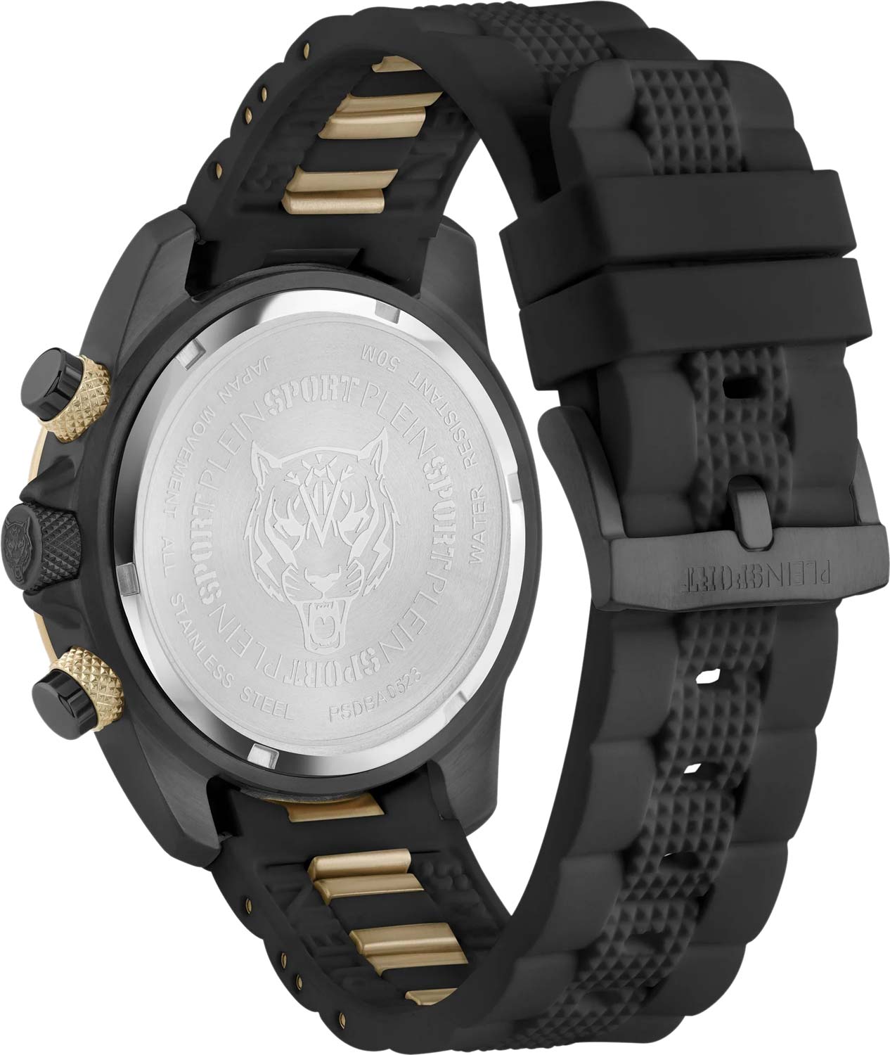 Немецкие кварцевые унисекс часы-хронографХронографФункция позволяет измерять отрезки времени с особой точностью: часы, минуты, секунды. Верным признаком хронографа является наличие на циферблате 3 дополнительных окошек-счётчиков. с секундомеромСекундомерСекундоме́р — прибор, способный измерять интервалы времени с точностью до долей секунды. Plein Sport Hurricane PSDBA0523, кварцевый механизм с высокой точностью. Класс водозащиты: 50 метров, позволит защитить корпус от случайных брызг или капель дождя. Корпус и безельБезельВнешний ободок, закрепляющий стекло. В спортивных часах так называется поворотное кольцо с делениями на циферблате, выполняет роль таймера – замеряет отрезки времени на шкале. Неподвижный безель – элемент декора. Однонаправленно вращающийся безель на дайверских часах позволяет фиксировать моменты погружения и выныривания на поверхность. выполнены из стали с IP-покрытиемIP-покрытиеМетод ионного напыления. Демонстрирует повышенную устойчивость к истиранию, окислению и химическим веществам. Под воздействием высокого давления и температуры около 1500°C молекулы металла надёжно соединяются с частицами корпуса часов.. Стрелки и метки с люминесцентным покрытиемЛюминесцентное покрытиеПозволяет считывать показания времени в темноте. Производители наносят на стрелки, часовые индексы, безель или поверхность циферблата светонакопительный состав, дающий холодное свечение.. Браслет из стали и силикона на стандартной застежке. Минеральное стеклоМинеральное стеклоМинеральное стекло представляет собой искусственно выращенный минерал кварца. Такое стекло отличается особой устойчивостью к повреждениям и царапинам. Уступает по некоторым качествам сапфировому стеклу. устойчивое к мелким механическим повреждениям. Окошко даты находится в положении между 4 и 5 часов.