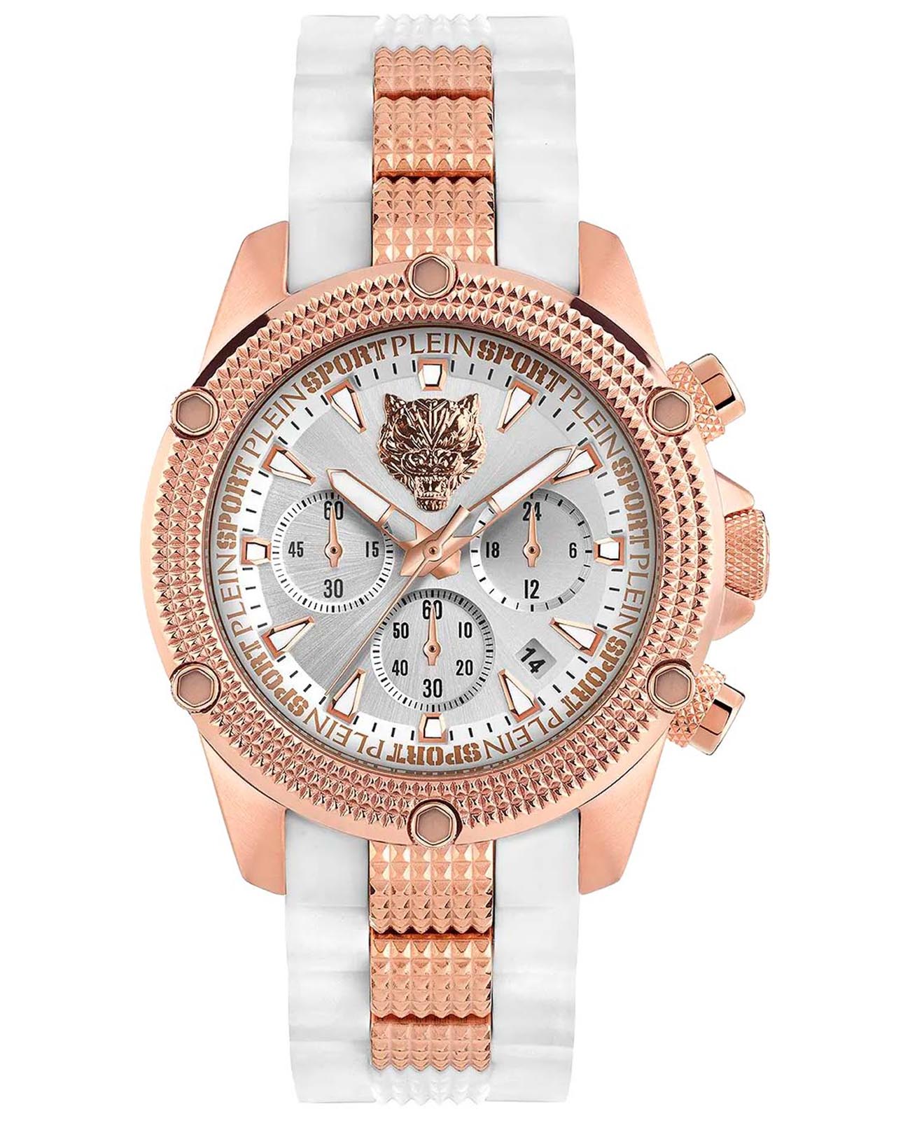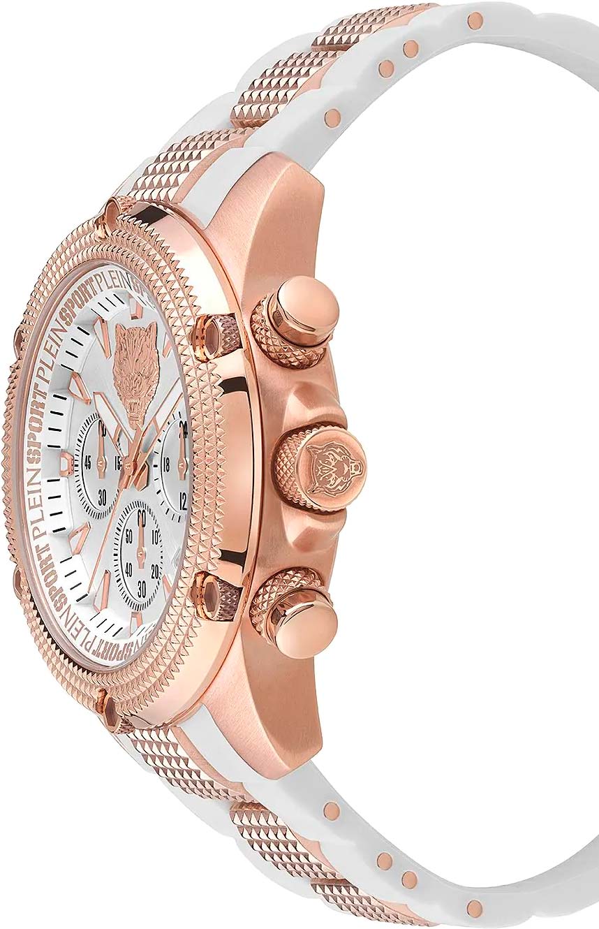 Немецкие кварцевые унисекс часы-хронографХронографФункция позволяет измерять отрезки времени с особой точностью: часы, минуты, секунды. Верным признаком хронографа является наличие на циферблате 3 дополнительных окошек-счётчиков. с секундомеромСекундомерСекундоме́р — прибор, способный измерять интервалы времени с точностью до долей секунды. Plein Sport Hurricane PSDBA0723, кварцевый механизм с высокой точностью. Класс водозащиты: 50 метров, позволит защитить корпус от случайных брызг или капель дождя. Корпус выполнен из стали с IP-покрытиемIP-покрытиеМетод ионного напыления. Демонстрирует повышенную устойчивость к истиранию, окислению и химическим веществам. Под воздействием высокого давления и температуры около 1500°C молекулы металла надёжно соединяются с частицами корпуса часов.. Стрелки и метки с люминесцентным покрытиемЛюминесцентное покрытиеПозволяет считывать показания времени в темноте. Производители наносят на стрелки, часовые индексы, безель или поверхность циферблата светонакопительный состав, дающий холодное свечение.. Силиконовый браслет на стандартной застежке. Минеральное стеклоМинеральное стеклоМинеральное стекло представляет собой искусственно выращенный минерал кварца. Такое стекло отличается особой устойчивостью к повреждениям и царапинам. Уступает по некоторым качествам сапфировому стеклу. устойчивое к мелким механическим повреждениям. Окошко даты находится в положении между 4 и 5 часов.