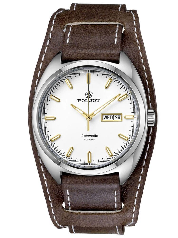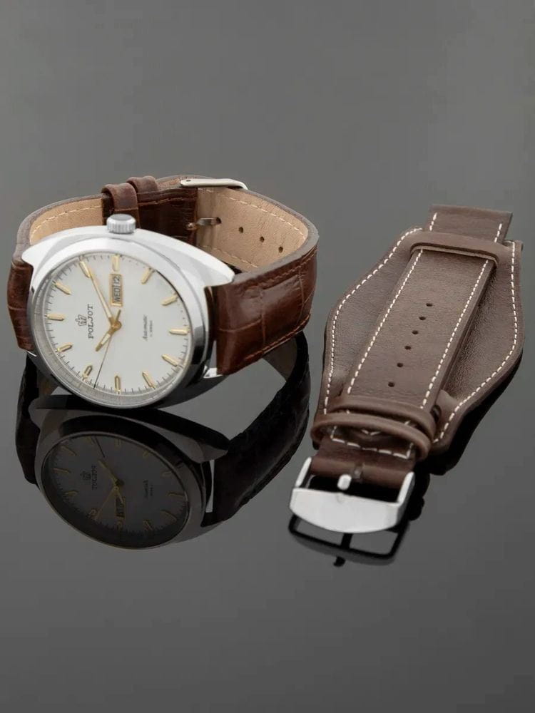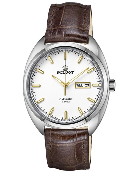 Poljot 8205.241276 — элегантные механические часы с автоподзаводом, сочетающем силу и изысканность. Корпус из нержавеющей стали подчеркивает надёжность и лаконичность дизайна, а глубокий циферблат с золотистыми стрелками придаёт модели благородный акцент. Проверенный японский механизм Miyota 8205 обеспечивает точность хода и долговечность, а плавное движение секундной стрелки подчёркивает качество сборки. Метки и стрелки с люминесцентным покрытиемЛюминесцентное покрытиеПозволяет считывать показания времени в темноте. Производители наносят на стрелки, часовые индексы, безель или поверхность циферблата светонакопительный состав, дающий холодное свечение. обеспечивают отличную читаемость при любом освещении, а окно даты добавляет практичности. Прочное минеральное стеклоМинеральное стеклоМинеральное стекло представляет собой искусственно выращенный минерал кварца. Такое стекло отличается особой устойчивостью к повреждениям и царапинам. Уступает по некоторым качествам сапфировому стеклу. защищает циферблат от царапин, а ремешок из натуральной кожи завершает утончённый облик модели. Poljot — гармония классики и современной механики, созданная для тех, кто ценит традиции и индивидуальность в каждой детали. В комплекте дополнительный ремешок с напульсником.