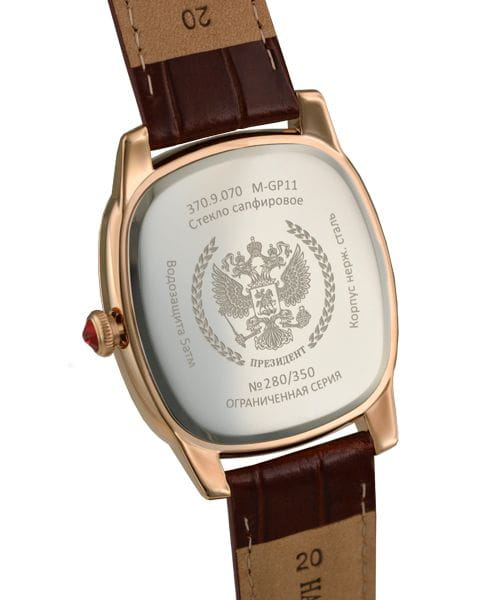 Часы «Президент» модели 3709070 — это мужские кварцевые наручные часы, сочетающие элегантный дизайн и надёжность. Механизм: японский кварцевый механизм Miyota GP11, обеспечивающий высокую точность. Функции: часы, минуты, секунды и дата. Корпус: из нержавеющей стали с PVD-покрытиемPVDУльтратонкое покрытие наносится в технике вакуумного напыления, сочетает в себе нитрид титана особой прочности со слоем золота или оксида хрома. Несёт в себе декоративную или защитную функцию. розового золота, размером 41 мм х 38 мм, толщиной 9,8 мм. Стекло: сапфировоеСапфировое стеклоПрочный и надёжный материал из кристалла сапфира синтетического происхождения, характеризующийся особой твёрдостью и устойчивостью к царапинам и повреждениям., устойчивое к царапинам. Водонепроницаемость: 5 ATM (50 метров), подходящая для повседневного использования. Ремешок: кожаный, шириной 20 мм, с классической застёжкой. Эти часы выпущены ограниченным тиражом в 350 экземпляров, что подчёркивает их эксклюзивность и статус.