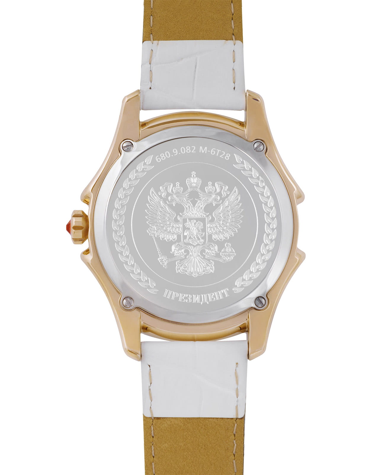 Стильные элегантные часы «Президент» — это идеальное дополнение к образу уверенной и целеустремлённой женщины. Модель выполнена в круглой форме с корпусом диаметром 39 мм и толщиной 11 мм, украшенным розовым золотом18-каратное золотоОбозначение по каратной системе пробирования, оно показывает, сколько драгоценного металла содержится в изделии. 18 карат - в составе 75% чистого золота, соответствует 750 пробе.