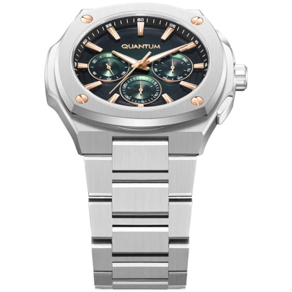 Quantum ADG1032.370 — это наручные часы, сочетающие в себе стиль, точность и надёжность. Модель выполнена в круглой форме из нержавеющей стали с минеральным стекломМинеральное стеклоМинеральное стекло представляет собой искусственно выращенный минерал кварца. Такое стекло отличается особой устойчивостью к повреждениям и царапинам. Уступает по некоторым качествам сапфировому стеклу., устойчивым к мелким повреждениям. Циферблат зелёного цвета оформлен штриховыми метками и оснащён функцией отображения даты, что делает его удобным для повседневного использования. Часы оснащены кварцевым механизмом, обеспечивающим высокую точность хода и минимальное обслуживание. Водонепроницаемость позволяет использовать их при плавании и других водных активностях без глубокого погружения. Стильная конструкция и универсальный дизайн делают модель подходящей для любого образа — от делового до неформального. Эти часы станут идеальным аксессуаром для тех, кто ценит сочетание элегантности, функциональности и надёжности — универсальное решение для повседневной носки и повседневных задач.