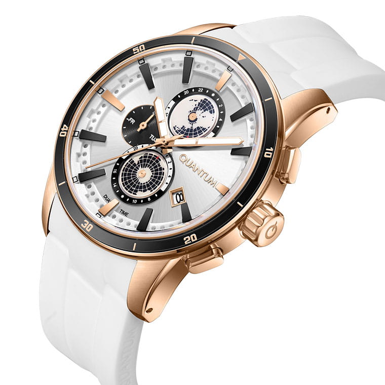 Мужские кварцевые часы Quantum ADG991.433 из коллекции Adrenaline — смелый спортивный акцент с функцией двойного времени. Корпус круглый, из нержавеющей стали с PVD-покрытиемPVDУльтратонкое покрытие наносится в технике вакуумного напыления, сочетает в себе нитрид титана особой прочности со слоем золота или оксида хрома. Несёт в себе декоративную или защитную функцию. цвета розового золота, диаметром 47 мм. Циферблат — бедый с индикацией даты, дня недели и второго часового поясаВторой часовой поясФункция, позволяющая отображать время двух часовых поясов одновременно.. Стекло — минеральноеМинеральное стеклоМинеральное стекло представляет собой искусственно выращенный минерал кварца. Такое стекло отличается особой устойчивостью к повреждениям и царапинам. Уступает по некоторым качествам сапфировому стеклу. с антибликовым покрытием. Водонепроницаемость 100 м. Ремешок — белый силиконовый на стандартной застёжке. Идеальный выбор для тех, кто ценит турецкий дизайн и активный образ жизни.