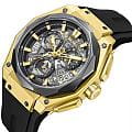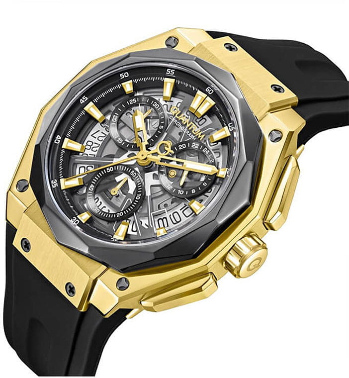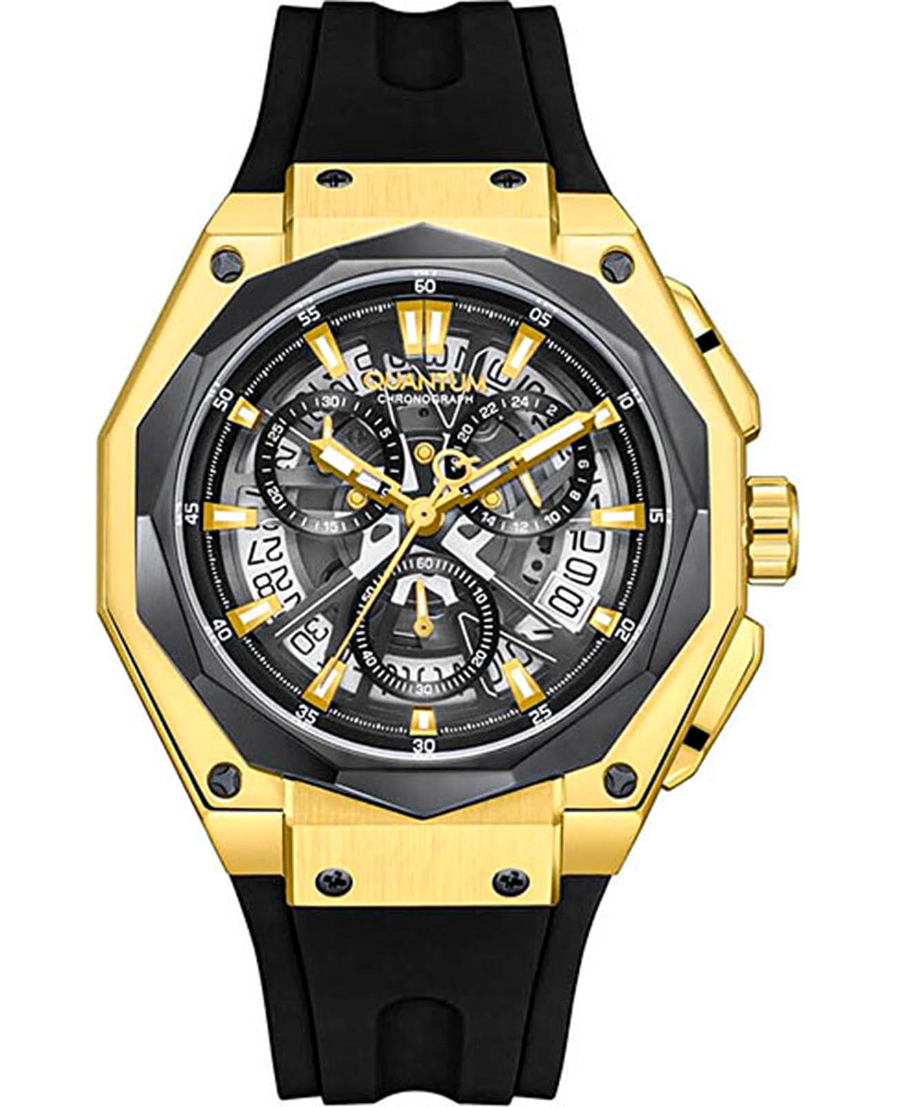 Мужские кварцевые часы Quantum из коллекции Hunter — круглый корпус размером 47 мм из нержавеющей стали с PVD-покрытиемPVDУльтратонкое покрытие наносится в технике вакуумного напыления, сочетает в себе нитрид титана особой прочности со слоем золота или оксида хрома. Несёт в себе декоративную или защитную функцию., оснащённый функциями хронографаХронографФункция позволяет измерять отрезки времени с особой точностью: часы, минуты, секунды. Верным признаком хронографа является наличие на циферблате 3 дополнительных окошек-счётчиков. и окошком даты. Стекло — минеральноеМинеральное стеклоМинеральное стекло представляет собой искусственно выращенный минерал кварца. Такое стекло отличается особой устойчивостью к повреждениям и царапинам. Уступает по некоторым качествам сапфировому стеклу. с антибликовым покрытием. Механизм — японский кварцевый Seiko. Водонепроницаемость 100 м. Ремешок — чёрный силиконовый на стандартной застёжке. Идеальный выбор для тех, кто ценит турецкий дизайн и функциональный спортивный стиль.