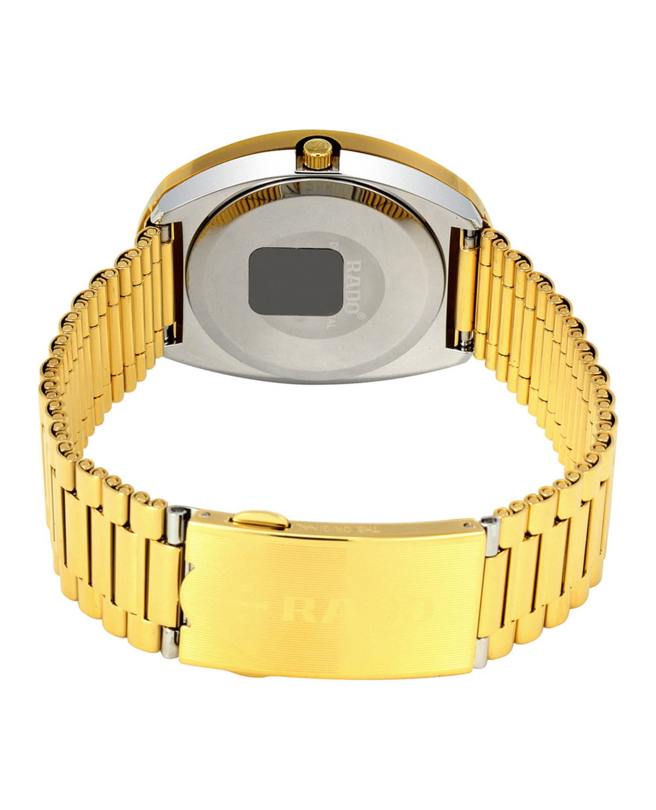 Мужские часы Rado The Original R12391633 с надёжным кварцевым механизмом. Корпус и браслет часов выполнены из нержавеющей стали с PVD-покрытиемPVDУльтратонкое покрытие наносится в технике вакуумного напыления, сочетает в себе нитрид титана особой прочности со слоем золота или оксида хрома. Несёт в себе декоративную или защитную функцию.. Стрелки с люминесцентным покрытиемЛюминесцентное покрытиеПозволяет считывать показания времени в темноте. Производители наносят на стрелки, часовые индексы, безель или поверхность циферблата светонакопительный состав, дающий холодное свечение. Super-LumiNova. Стальной браслет на раскладной застёжкеРаскладная застёжкаТакой тип застёжки используется только на браслетах из металла. Она никогда не раскрывается полностью, происходит разделение на 2 и более частей. Раскладывающая застёжка снизит вероятность потери часов к минимуму.. Класс водозащиты: 30 метров, позволит защитить корпус от случайных брызг или капель дождя. Циферблат инкрустирован сапфирами. Окошки дня недели и даты находятся в положении 3 часа.