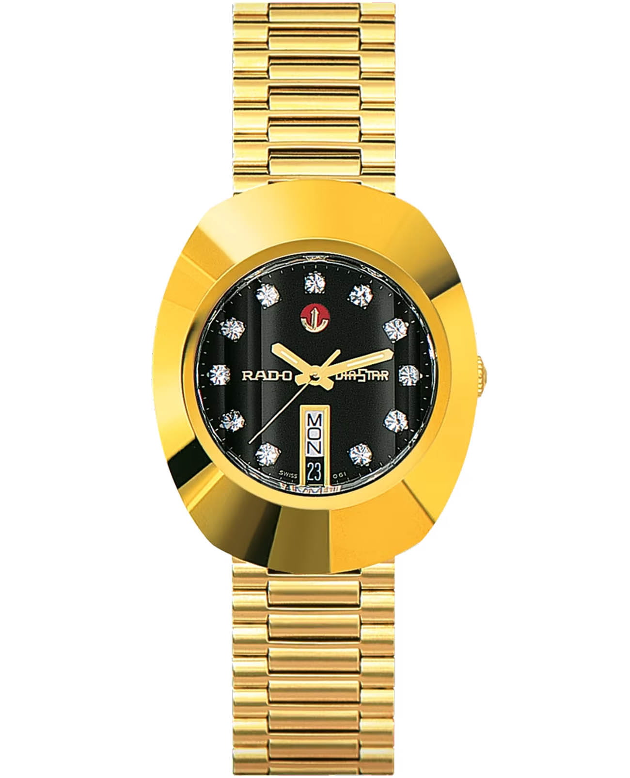 Мужские часы Rado The Original Automatic R12413613 с надёжным автоматическим механизмом. Корпус и браслет часов выполнены из нержавеющей стали c PVD-покрытиемPVDУльтратонкое покрытие наносится в технике вакуумного напыления, сочетает в себе нитрид титана особой прочности со слоем золота или оксида хрома. Несёт в себе декоративную или защитную функцию.. Стальной браслет на раскладной застёжкеРаскладная застёжкаТакой тип застёжки используется только на браслетах из металла. Она никогда не раскрывается полностью, происходит разделение на 2 и более частей. Раскладывающая застёжка снизит вероятность потери часов к минимуму.. Класс водозащиты: 30 метров, позволит защитить корпус от случайных брызг или капель дождя. Циферблат с узорами инкрустирован сапфирами. Окошко даты и дня недели находится в положении 6 часов. Стрелки и метки с люминесцентным покрытиемЛюминесцентное покрытиеПозволяет считывать показания времени в темноте. Производители наносят на стрелки, часовые индексы, безель или поверхность циферблата светонакопительный состав, дающий холодное свечение..