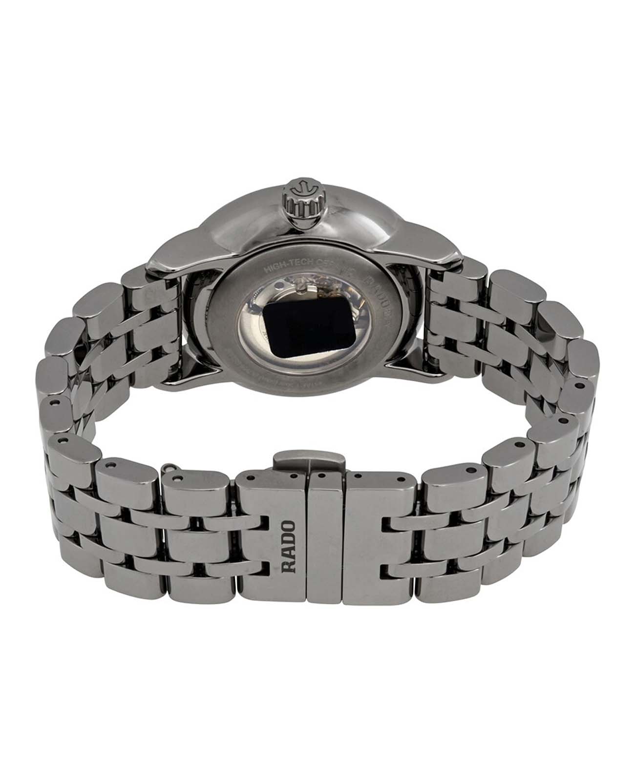 Женские механические швейцарские часы с автоподзаводом Rado Diamaster R14026102. Сапфировое стеклоСапфировое стеклоПрочный и надёжный материал из кристалла сапфира синтетического происхождения, характеризующийся особой твёрдостью и устойчивостью к царапинам и повреждениям. устойчивое к мелким механическим повреждениям. Корпус часов изготовлен из высокотехнологичной керамикиВысокотехнологичная керамикаИнновационный запатентованный Rado материал с гладкой или матовой поверхностью. Керамика за счёт кристаллической структуры обладает повышенной устойчивостью от возникновения царапин. Материал способен принимать температуру тела человека, обеспечивая невероятный комфорт при ношении.. Окошко даты находится в положении 6 часов. Класс водозащиты: 50 метров, позволит защитить корпус от случайных брызг или капель дождя. Браслет из высокотехнологичной керамикиВысокотехнологичная керамикаИнновационный запатентованный Rado материал с гладкой или матовой поверхностью. Керамика за счёт кристаллической структуры обладает повышенной устойчивостью от возникновения царапин. Материал способен принимать температуру тела человека, обеспечивая невероятный комфорт при ношении. на застёжке «бабочка» с кнопкамиЗастёжка "бабочка"Такой вид застёжки дополняется предохранителями, помогающими избежать случайного раскрытия браслета. Обладают изящным исполнением. .