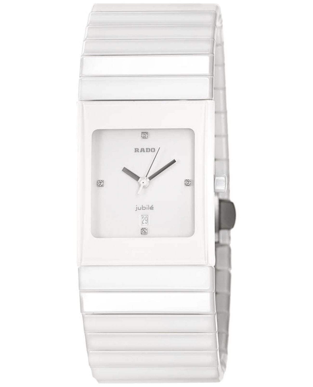 Швейцарские часы Rado Ceramica R21711702, кварцевый механизм с высокой точностью. Сапфировое стеклоСапфировое стеклоПрочный и надёжный материал из кристалла сапфира синтетического происхождения, характеризующийся особой твёрдостью и устойчивостью к царапинам и повреждениям. устойчивое к появлению царапин, обладающее высокой прозрачностью. Корпус часов изготовлен из нержавеющей стали и керамики. Класс водозащиты: 30 метров, позволит защитить корпус от случайных брызг или капель дождя. Керамический браслет на раскладной застёжкойРаскладная застёжкаТакой тип застёжки используется только на браслетах из металла. Она никогда не раскрывается полностью, происходит разделение на 2 и более частей. Раскладывающая застёжка снизит вероятность потери часов к минимуму... Циферблат украшен 4 бриллиантами.