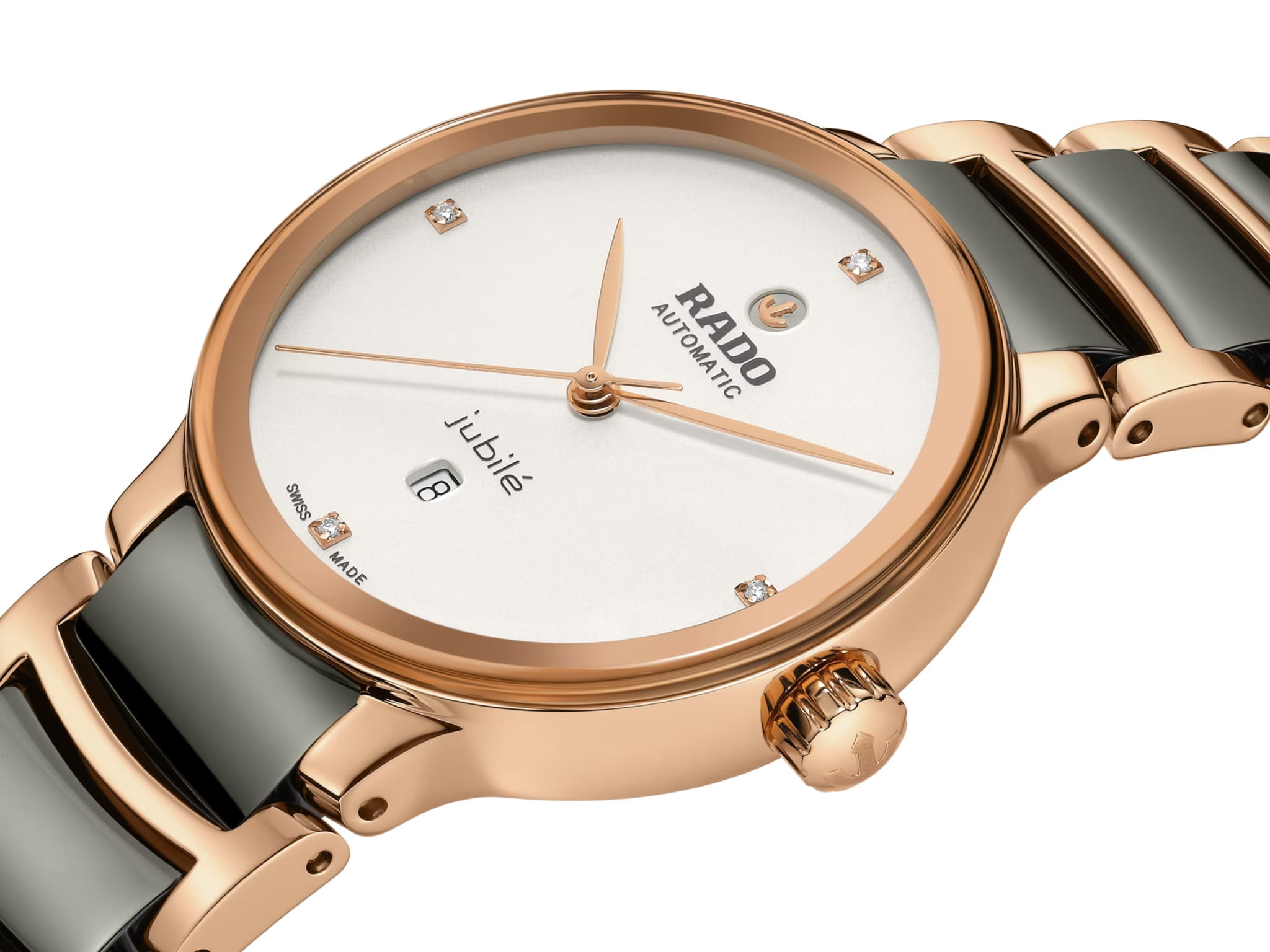 Швейцарские женские механические часы с автоматическим подзаводом Rado Centrix Automatic Diamonds R30019722. Корпус часов изготовлен из нержавеющей стали с PVD-покрытиемPVDУльтратонкое покрытие наносится в технике вакуумного напыления, сочетает в себе нитрид титана особой прочности со слоем золота или оксида хрома. Несёт в себе декоративную или защитную функцию.. Браслет из стали и высокотехнологичной керамикиВысокотехнологичная керамикаИнновационный запатентованный Rado материал с гладкой или матовой поверхностью. Керамика за счёт кристаллической структуры обладает повышенной устойчивостью от возникновения царапин. Материал способен принимать температуру тела человека, обеспечивая невероятный комфорт при ношении. на раскладной застёжкеРаскладная застёжкаТакой тип застёжки используется только на браслетах из металла. Она никогда не раскрывается полностью, происходит разделение на 2 и более частей. Раскладывающая застёжка снизит вероятность потери часов к минимуму.. Сапфировое стеклоСапфировое стеклоПрочный и надёжный материал из кристалла сапфира синтетического происхождения, характеризующийся особой твёрдостью и устойчивостью к царапинам и повреждениям. устойчивое к мелким механическим повреждениям. Класс водозащиты: 50 метров, позволит защитить корпус от случайных брызг или капель дождя. Окошко даты находится в положении 6 часов. Циферблат инкрустирован бриллиантами.