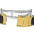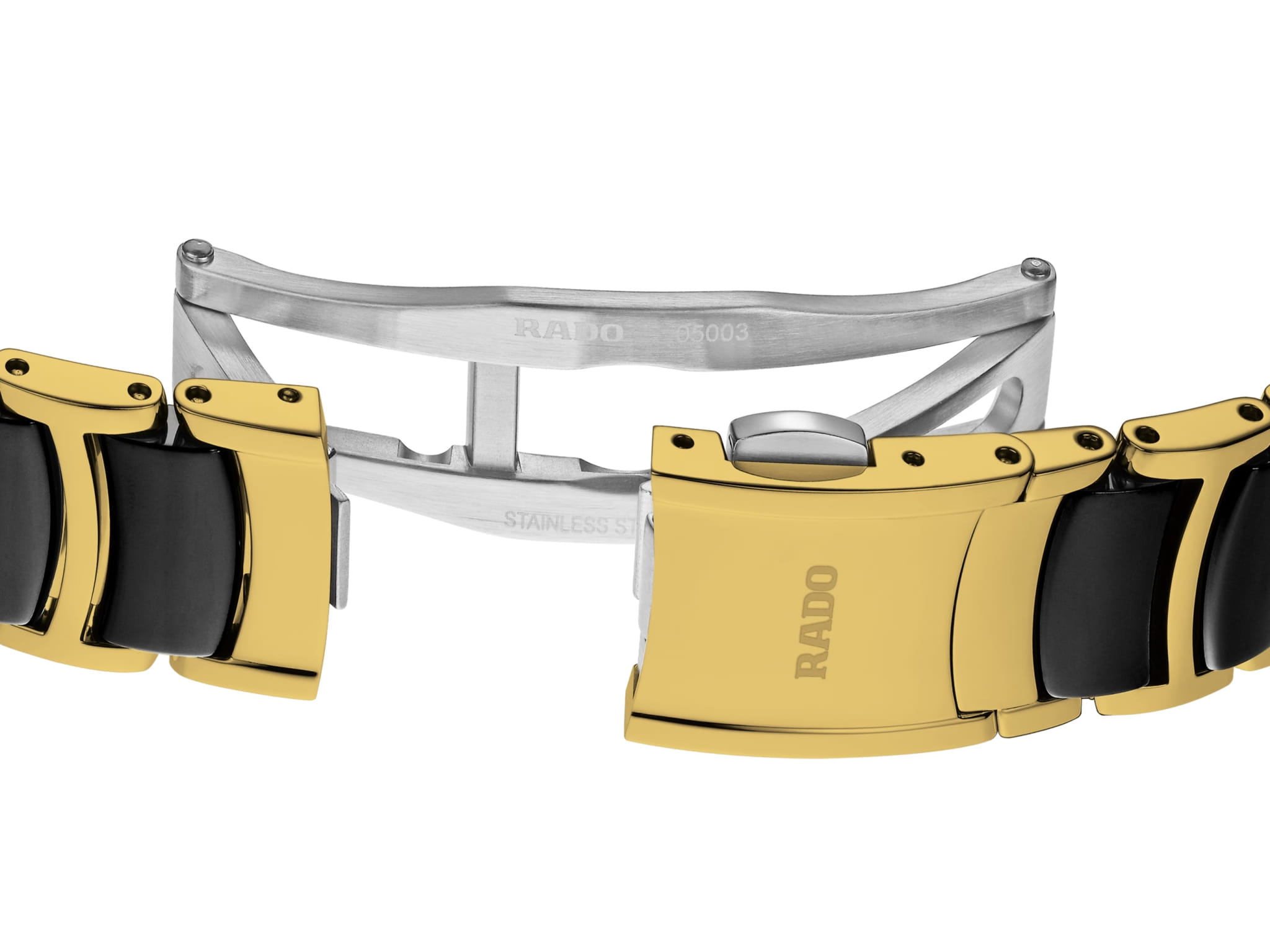 Браслет изготовлен из стали с PVD-покрытиемPVDУльтратонкое покрытие наносится в технике вакуумного напыления, сочетает в себе нитрид титана особой прочности со слоем золота или оксида хрома. Несёт в себе декоративную или защитную функцию. и высокотехнологичной керамикиВысокотехнологичная керамикаИнновационный запатентованный Rado материал с гладкой или матовой поверхностью. Керамика за счёт кристаллической структуры обладает повышенной устойчивостью от возникновения царапин. Материал способен принимать температуру тела человека, обеспечивая невероятный комфорт при ношении., что создаёт эффектное сочетание материалов. Браслет закреплён на удобной и надёжной раскладной застёжкеРаскладная застёжкаТакой тип застёжки используется только на браслетах из металла. Она никогда не раскрывается полностью, происходит разделение на 2 и более частей. Раскладывающая застёжка снизит вероятность потери часов к минимуму., обеспечивая комфортное и безопасное крепление на запястье.