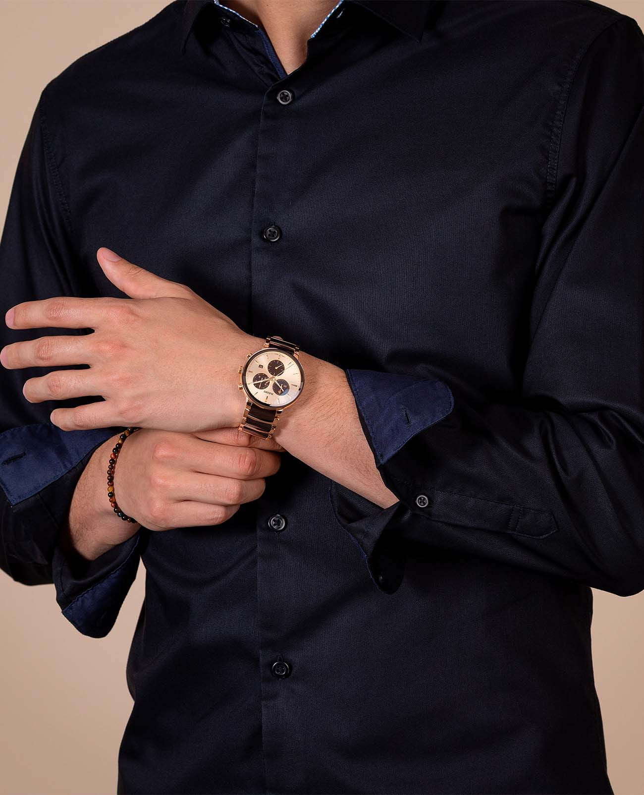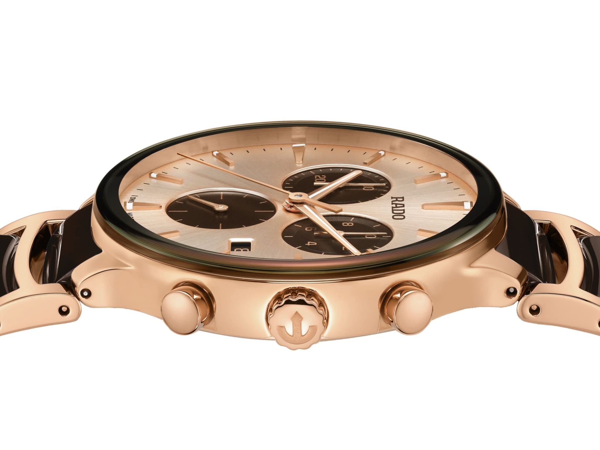 Мужские кварцевые часы Rado Centrix Chronograph — это гармоничное сочетание художественного дизайна и технического совершенства. Корпус диаметром 41 мм и толщиной 11,4 мм выполнен из нержавеющей стали с PVD-покрытиемPVDУльтратонкое покрытие наносится в технике вакуумного напыления, сочетает в себе нитрид титана особой прочности со слоем золота или оксида хрома. Несёт в себе декоративную или защитную функцию. розового золота. Циферблат цвета шампань с эффектом «солнечные лучи» оформлен розовыми индексами с люминесцентным покрытиемЛюминесцентное покрытиеПозволяет считывать показания времени в темноте. Производители наносят на стрелки, часовые индексы, безель или поверхность циферблата светонакопительный состав, дающий холодное свечение. Super-Luminova®, обеспечивающим отличную читаемость в темноте. Циферблат защищён выпуклым сапфировым стекломСапфировое стеклоПрочный и надёжный материал из кристалла сапфира синтетического происхождения, характеризующийся особой твёрдостью и устойчивостью к царапинам и повреждениям. с антибликовым покрытиемАнтибликовое покрытиеСлой оксида металла в 0,13-0,3 микрон, благодаря которому стекло часов не бликует и не отражает свет. Антибликовое покрытие уменьшает отражение света в 10 раз, обеспечивая отличную читаемость показателей циферблата. с обеих сторон. Механизм — швейцарский кварцевый с функцией хронографаХронографФункция позволяет измерять отрезки времени с особой точностью: часы, минуты, секунды. Верным признаком хронографа является наличие на циферблате 3 дополнительных окошек-счётчиков., оснащённый 22 камнями и технологиями Precidrive и Heavydrive, обеспечивающими точность хода ±10 секунд в год. Циферблат включает три субциферблата: 30-минутный счётчик, индикатор одной десятой секунды и малые секунды в положении 6 часов. Окошко даты расположено в положении 4 часов. Часы оснащены браслетом из полированной нержавеющей стали с вставками из высокотехнологичной керамикиВысокотехнологичная керамикаИнновационный запатентованный Rado материал с гладкой или матовой поверхностью. Керамика за счёт кристаллической структуры обладает повышенной устойчивостью от возникновения царапин. Материал способен принимать температуру тела человека, обеспечивая невероятный комфорт при ношении. коричневого цвета и застёжка «бабочка» с кнопкамиЗастёжка "бабочка"Такой вид застёжки дополняется предохранителями, помогающими избежать случайного раскрытия браслета. Обладают изящным исполнением. из матовой стали. Водонепроницаемость 50 м позволяет использовать часы в повседневных условиях. Гарантия — 5 лет. Идеальный выбор для тех, кто ценит точность, стиль и швейцарское качество.