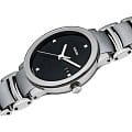 Утончённая модель в минималистичном стиле никогда не выйдет из моды, гармонично сочетаясь с любым нарядом. Элегантный чёрный циферблат декорирован 4 бриллиантами в 0.009 карат, драгоценные камни с роскошным блеском использованы вместо часовых меток. Часы оснащены высокоточным кварцевым механизмом ETA 956.112. Нержавеющая сталь 316L. Надёжное стекло из сапфира. Водостойкость до 3 бар. Отображение текущего числа. Диаметр корпуса: 28 мм.