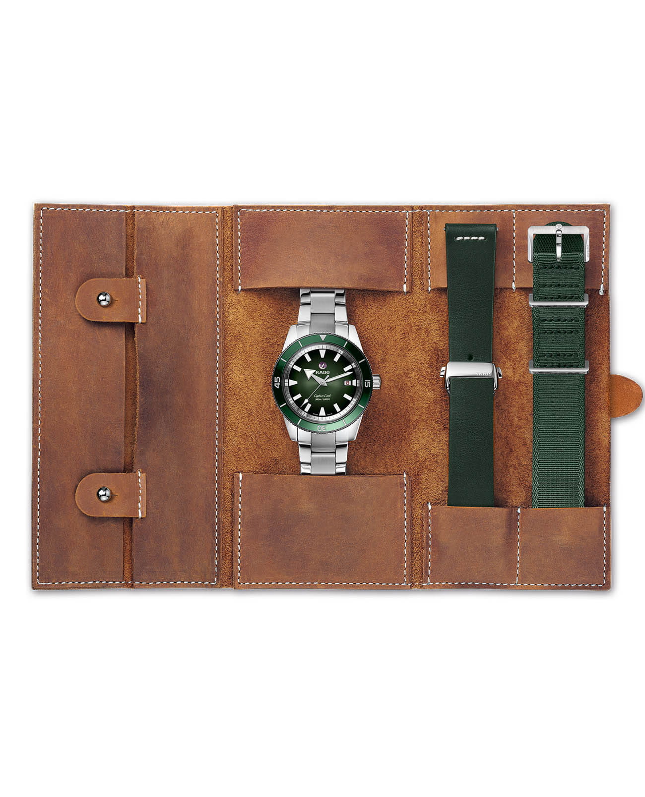 Премиальная модель обладает винтажным характером, зелёный циферблат обращает наше внимание на оригинальные стрелки в виде меча и стрелы. Часы обладают высокими показателями водонепроницаемости - сохранение герметичности до 30 бар, что стало возможным благодаря задней крышке и заводной головке с винтовыми фиксаторами. Автоподзавод. Швейцарский калибр ETA C07.611 с 80-часовым резервом хода. Антибликовая обработка сапфирового стекла. Корпус из хирургической стали 316L, безельБезельВнешний ободок, закрепляющий стекло. В спортивных часах так называется поворотное кольцо с делениями на циферблате, выполняет роль таймера – замеряет отрезки времени на шкале. Неподвижный безель – элемент декора. Однонаправленно вращающийся безель на дайверских часах позволяет фиксировать моменты погружения и выныривания на поверхность. из высокотехнологичной керамикиВысокотехнологичная керамикаИнновационный запатентованный Rado материал с гладкой или матовой поверхностью. Керамика за счёт кристаллической структуры обладает повышенной устойчивостью от возникновения царапин. Материал способен принимать температуру тела человека, обеспечивая невероятный комфорт при ношении.. Прочный стальной браслет. Отображение числа. Диаметр корпуса: 42 мм.