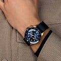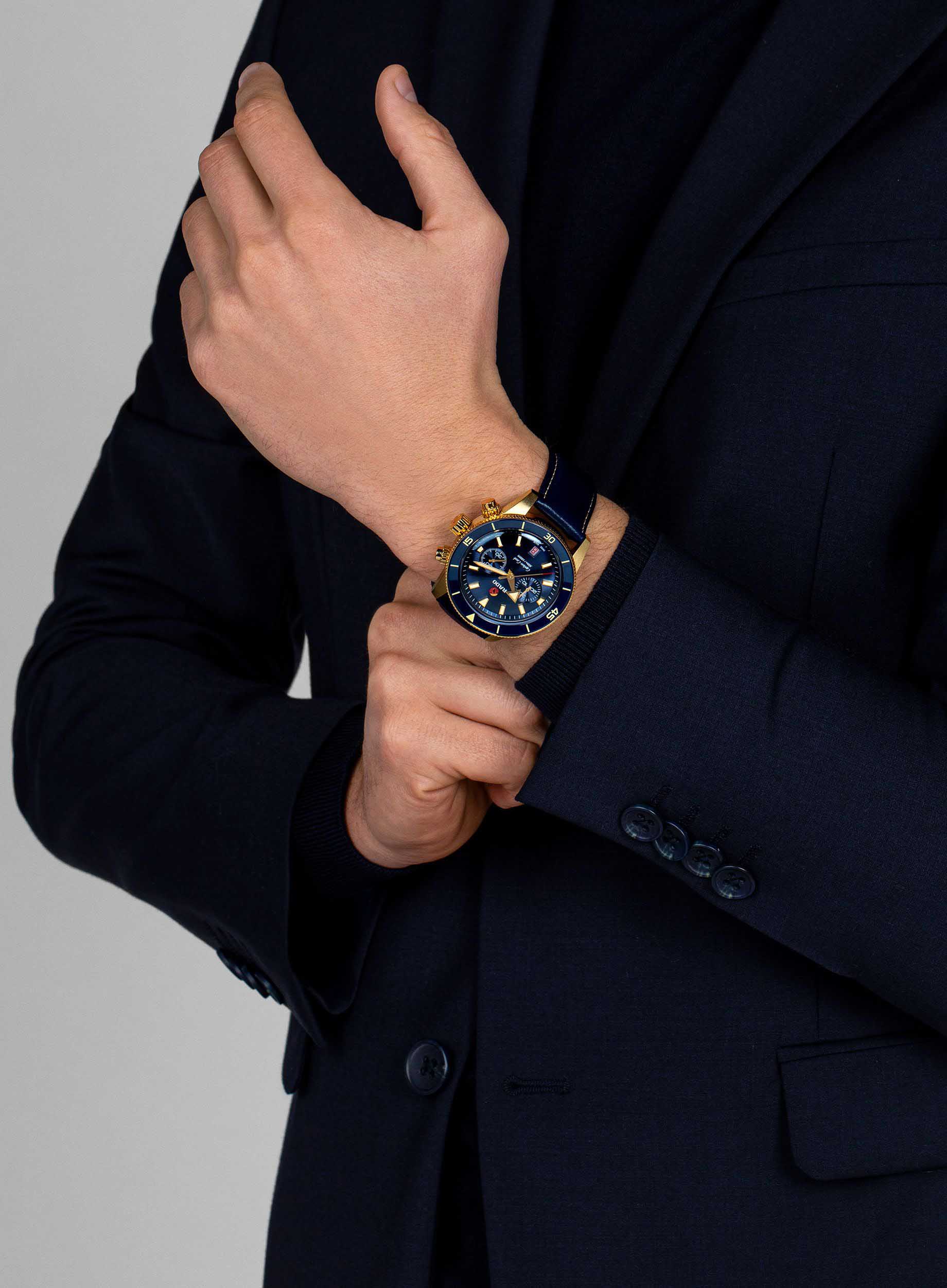 Хронограф Капитана Кука имеет характерное, устойчивое к царапинам Сапфировое стеклоСапфировое стеклоПрочный и надёжный материал из кристалла сапфира синтетического происхождения, характеризующийся особой твёрдостью и устойчивостью к царапинам и повреждениям. с антибликовым покрытием на обеих сторонах. Тонкий стильный корпус диаметром 43 мм из матовой бронзы имеет полированную синюю высокотехнологичную керамическую вставку на безелеБезельВнешний ободок, закрепляющий стекло. В спортивных часах так называется поворотное кольцо с делениями на циферблате, выполняет роль таймера – замеряет отрезки времени на шкале. Неподвижный безель – элемент декора. Однонаправленно вращающийся безель на дайверских часах позволяет фиксировать моменты погружения и выныривания на поверхность., дополняющую голубой циферблат Sunray. На цифры, маркеры и стрелочки нанесено люминесцентное покрытиеЛюминесцентное покрытиеПозволяет считывать показания времени в темноте. Производители наносят на стрелки, часовые индексы, безель или поверхность циферблата светонакопительный состав, дающий холодное свечение. Super-LumiNova®. Внутри новый, более тонкий автоматический механизм R801 с 37 камнями, пятью стрелками и 59 часами запаса хода благодаря антимагнитной пружине Nivachron™Nivachron™Специально разработанный инновационный сплав Nivachron™ повышает устойчивость часов к воздействию магнитных полей., превосходит стандартные требования к испытаниям с 3 до 5 положений для более высокой точности. Модель поставляется с тканевым ремешком с золотистой полосой по центру, а также синим кожаным ремешком и дополнительным тканевым ремешком темно-синего цвета.