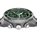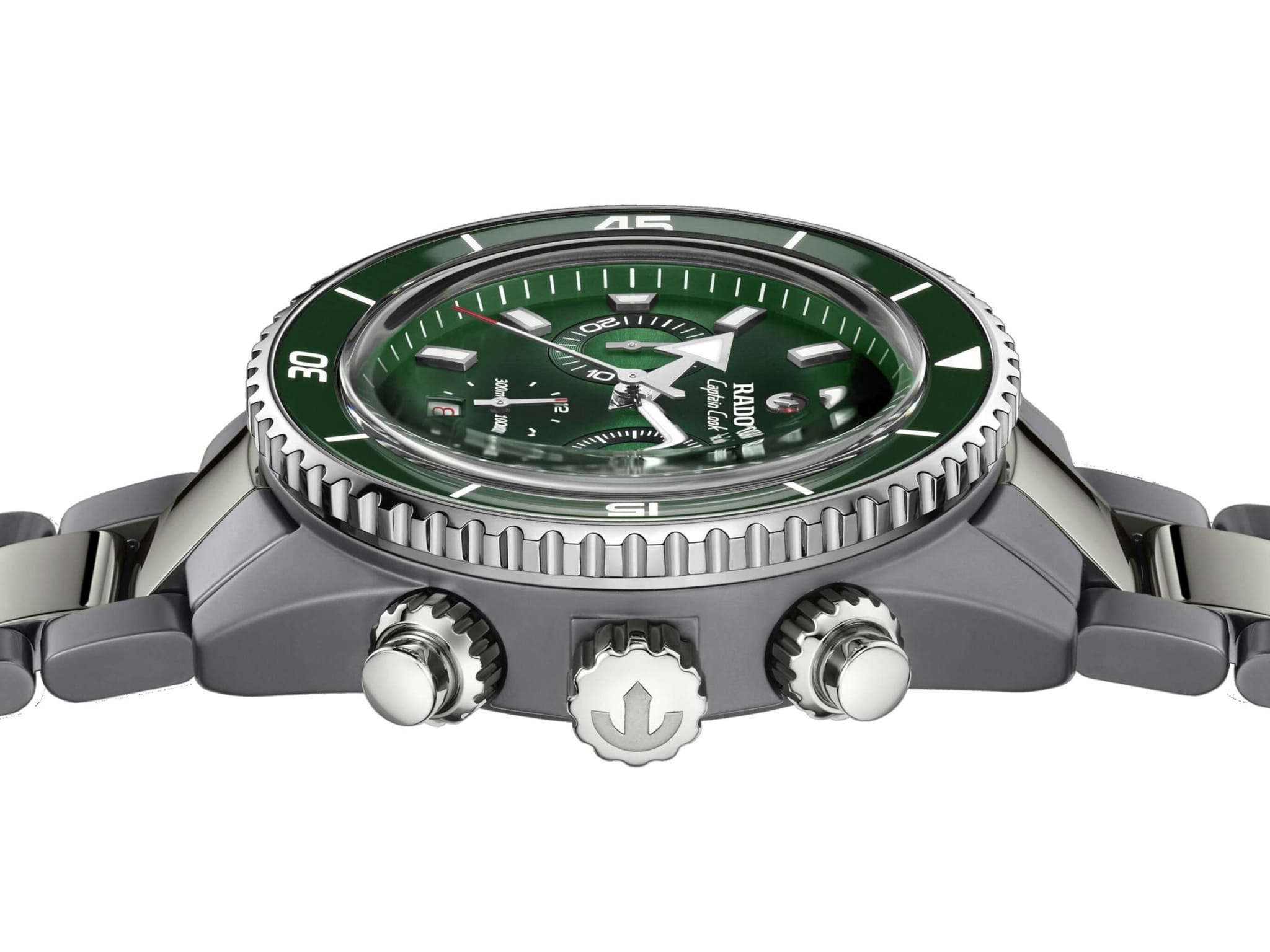 Мужские механические часы с автоподзаводом Rado Captain Cook — это вершина инженерной мысли и инноваций в материаловедении. Корпус диаметром 43 мм и толщиной 16,2 мм выполнен из цельного блока высокотехнологичной плазменной керамикиВысокотехнологичная плазменная керамикаИнновационный материал, технология запатентована. Выплавление керамики осуществляется в печи при 20 000 °C, белоснежный материал под воздействием ультравысокой температуры приобретает уникальный блеск, присущий металлам., созданной в экстремальных условиях — при температуре 20 000 °C, что изменило её молекулярную структуру и придало уникальное металлическое покрытие. БезельБезельВнешний ободок, закрепляющий стекло. В спортивных часах так называется поворотное кольцо с делениями на циферблате, выполняет роль таймера – замеряет отрезки времени на шкале. Неподвижный безель – элемент декора. Однонаправленно вращающийся безель на дайверских часах позволяет фиксировать моменты погружения и выныривания на поверхность. — вращающийся, стальной, с инкрустированным кольцом из зелёной керамики и метками с белым люминесцентным покрытиемЛюминесцентное покрытиеПозволяет считывать показания времени в темноте. Производители наносят на стрелки, часовые индексы, безель или поверхность циферблата светонакопительный состав, дающий холодное свечение. Super-Luminova®. Циферблат зелёного цвета оформлен тремя субциферблатами: 12-часовой, 30-минутный и малые секунды. Окошко даты расположено в положении 6 часов. Циферблат защищён сапфировым стекломСапфировое стеклоПрочный и надёжный материал из кристалла сапфира синтетического происхождения, характеризующийся особой твёрдостью и устойчивостью к царапинам и повреждениям. с антибликовым покрытиемАнтибликовое покрытиеСлой оксида металла в 0,13-0,3 микрон, благодаря которому стекло часов не бликует и не отражает свет. Антибликовое покрытие уменьшает отражение света в 10 раз, обеспечивая отличную читаемость показателей циферблата. с обеих сторон, устойчивым к царапинам. Механизм — автоматический хронограф с антимагнитной пружиной Nivachron™Nivachron™Специально разработанный инновационный сплав Nivachron™ повышает устойчивость часов к воздействию магнитных полей., отрегулированный в пяти положениях. В центре циферблата — подвижной якорь на рубиновой пластине. Часы оснащены браслетом из матовой и полированной высокотехнологичной плазменной керамикиВысокотехнологичная плазменная керамикаИнновационный материал, технология запатентована. Выплавление керамики осуществляется в печи при 20 000 °C, белоснежный материал под воздействием ультравысокой температуры приобретает уникальный блеск, присущий металлам. с трёхсекционной застёжкой из титана. Водонепроницаемость 300 м позволяет использовать часы для профессионального плавания и дайвинга. Идеальный выбор для тех, кто ценит передовые технологии, точность и смелый дизайн.