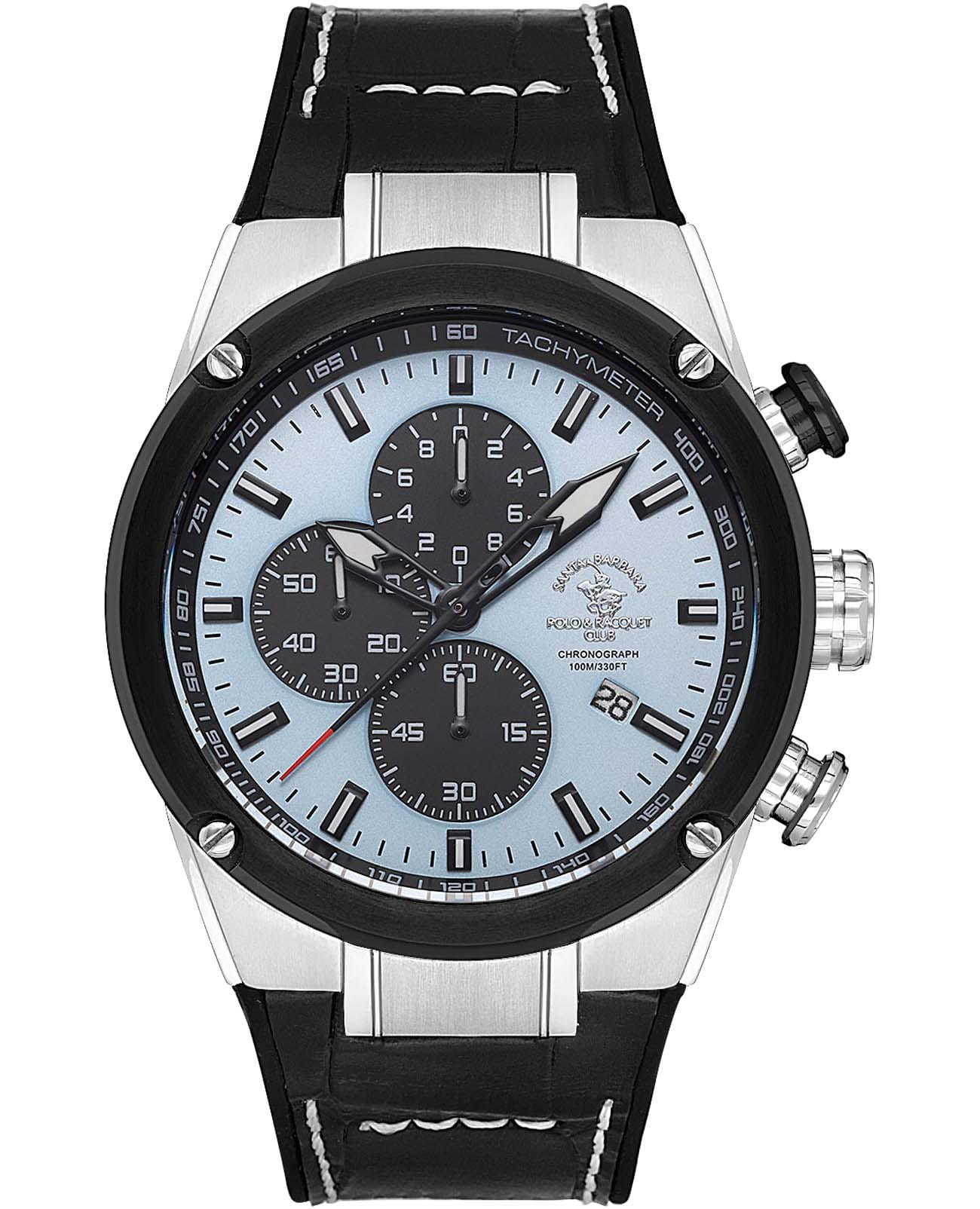 Мужские кварцевые часы-хронографХронографФункция позволяет измерять отрезки времени с особой точностью: часы, минуты, секунды. Верным признаком хронографа является наличие на циферблате 3 дополнительных окошек-счётчиков. с секундомеромСекундомерСекундоме́р — прибор, способный измерять интервалы времени с точностью до долей секунды. Santa Barbara Polo & Racquet Club SB.3.10001-2 — воплощение элегантности и технического совершенства. Корпус из нержавеющей стали серебристого цвета, диаметром 45 мм, что делает их устойчивыми к внешним воздействиям и придает благородный вид. Стрелки и метки с люминесцентным покрытиемЛюминесцентное покрытиеПозволяет считывать показания времени в темноте. Производители наносят на стрелки, часовые индексы, безель или поверхность циферблата светонакопительный состав, дающий холодное свечение., обеспечивающим хорошую читаемость в темноте. Неподвижный безельБезельВнешний ободок, закрепляющий стекло. В спортивных часах так называется поворотное кольцо с делениями на циферблате, выполняет роль таймера – замеряет отрезки времени на шкале. Неподвижный безель – элемент декора. Однонаправленно вращающийся безель на дайверских часах позволяет фиксировать моменты погружения и выныривания на поверхность. с IP-покрытиемIP-покрытиеМетод ионного напыления. Демонстрирует повышенную устойчивость к истиранию, окислению и химическим веществам. Под воздействием высокого давления и температуры около 1500°C молекулы металла надёжно соединяются с частицами корпуса часов. черного цвета. Циферблат защищён минеральным стекломМинеральное стеклоМинеральное стекло представляет собой искусственно выращенный минерал кварца. Такое стекло отличается особой устойчивостью к повреждениям и царапинам. Уступает по некоторым качествам сапфировому стеклу. устойчивое к царапинам и механическим повреждениям. Окошко даты находится в положении 4 часа, тахиметрТахиметрРазмеченная шкала, располагается на ободке или безеле часов. Тахиметр позволяет рассчитать скорость на определённом участке пути, расстояние измеряется в километрах или милях. по внешнему краю. Кожаный ремешок на стандартной застёжке обеспечивает комфортное и безопасное ношение. Водонепроницаемость 100 метров позволит плавать, нырять и заниматься другими водными видами спорта. Идеальный выбор для тех, кто ценит элегантный дизайн и качество.
