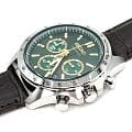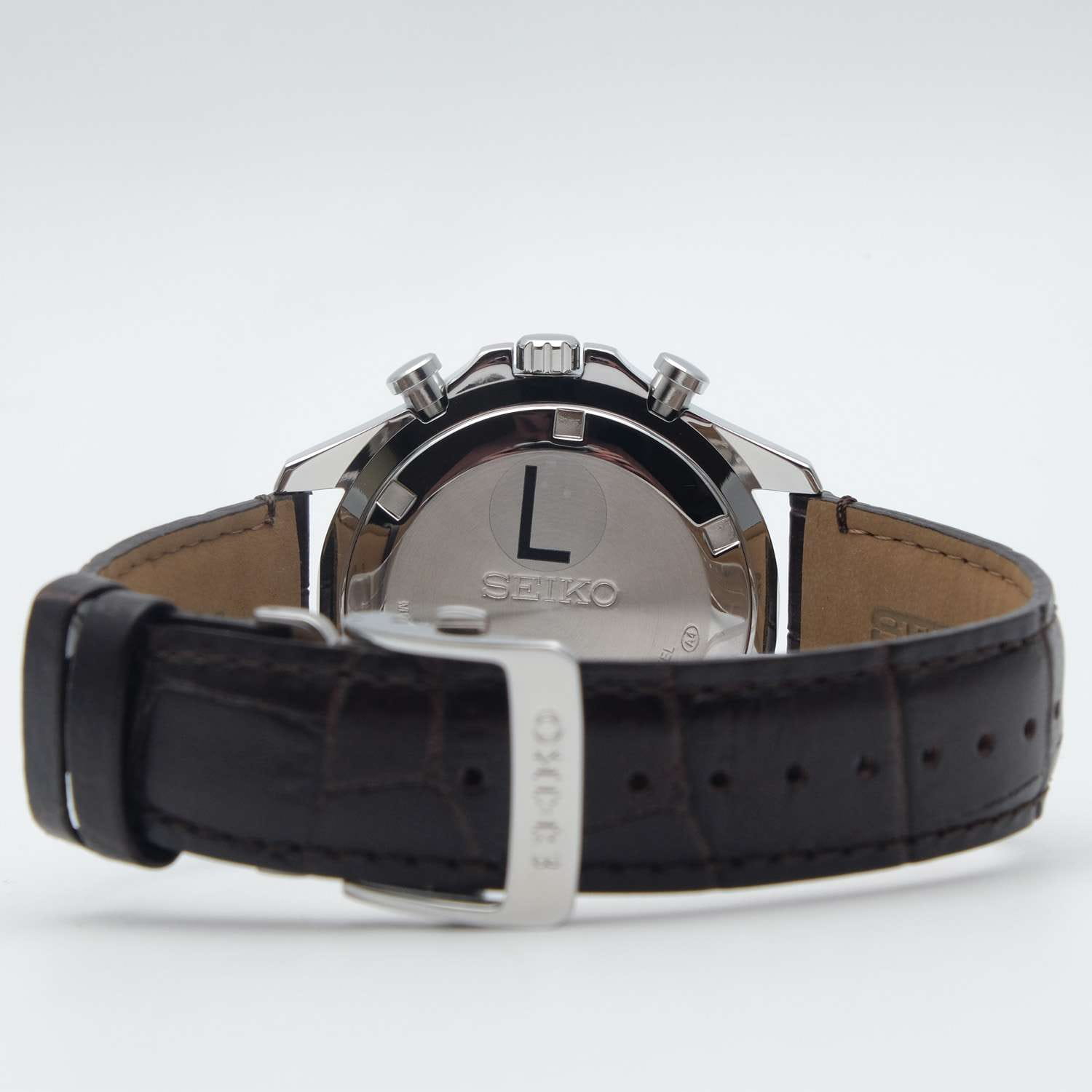 Мужские кварцевые часы-хронограф Seiko — это надёжный и функциональный аксессуар. Корпус диаметром 42 мм выполнен из нержавеющей стали 316L. Циферблат оформлен штрихами и стрелками. Присутствуют три субциферблата хронографа. Окошко даты расположено в положении между 4 и 5 часов. На циферблате присутствует шкала тахиметраТахиметрРазмеченная шкала, располагается на ободке или безеле часов. Тахиметр позволяет рассчитать скорость на определённом участке пути, расстояние измеряется в километрах или милях.. Стрелки и метки с люминесцентным покрытиемЛюминесцентное покрытиеПозволяет считывать показания времени в темноте. Производители наносят на стрелки, часовые индексы, безель или поверхность циферблата светонакопительный состав, дающий холодное свечение., обеспечивающим хорошую читаемость в темноте. Циферблат защищён прочным закалённым минеральным стеклом Hardlex. Механизм — японское кварцевое движение калибра 8T67 с функциями хронографаХронографФункция позволяет измерять отрезки времени с особой точностью: часы, минуты, секунды. Верным признаком хронографа является наличие на циферблате 3 дополнительных окошек-счётчиков. и секундомераСекундомерСекундоме́р — прибор, способный измерять интервалы времени с точностью до долей секунды.. Часы оснащены коричневым кожаным ремешком на классической пряжке. Водонепроницаемость 100 м позволяет использовать часы для плавания и повседневного ношения. Идеальный выбор для тех, кто ценит японское качество и универсальный дизайн.