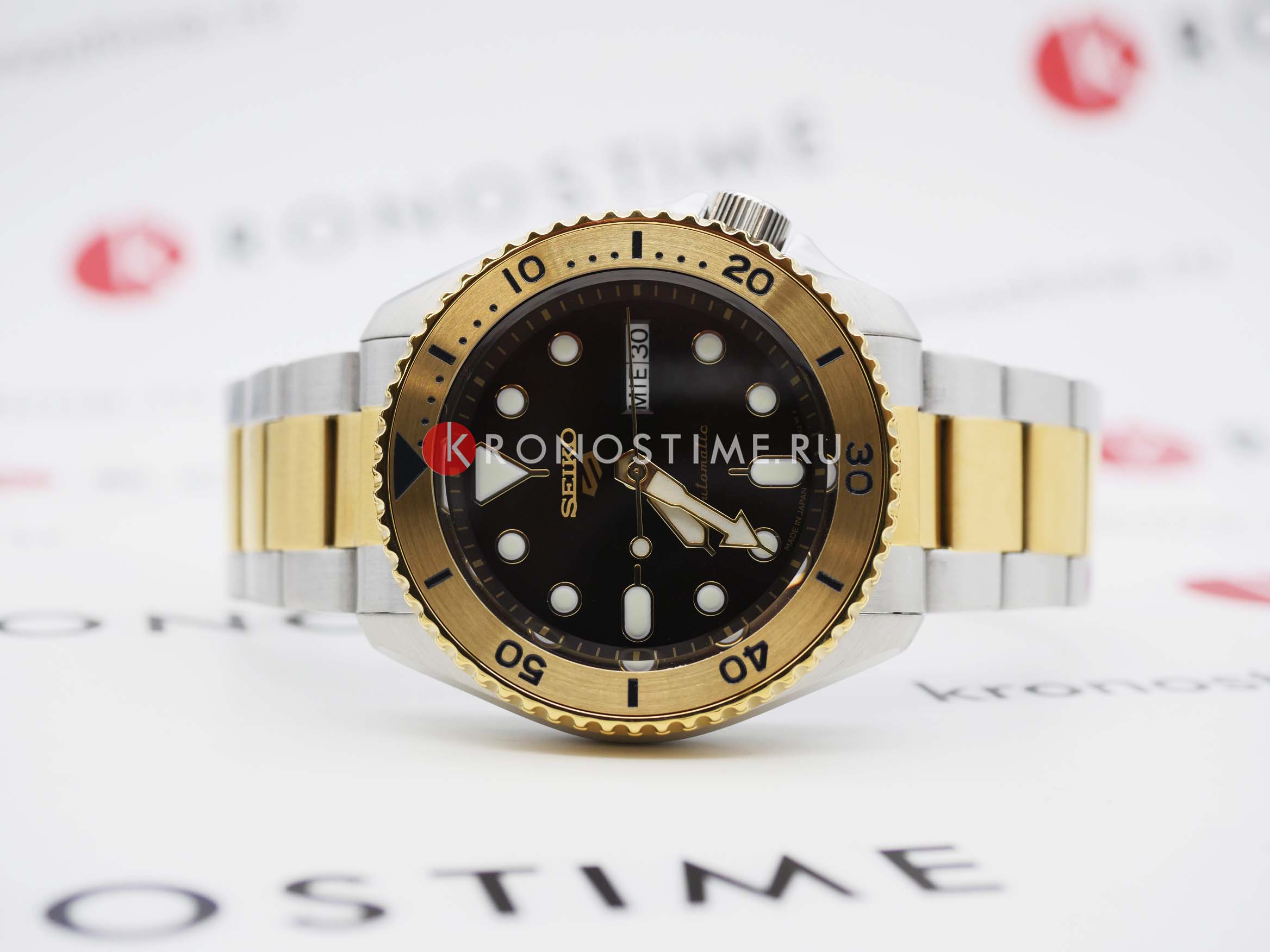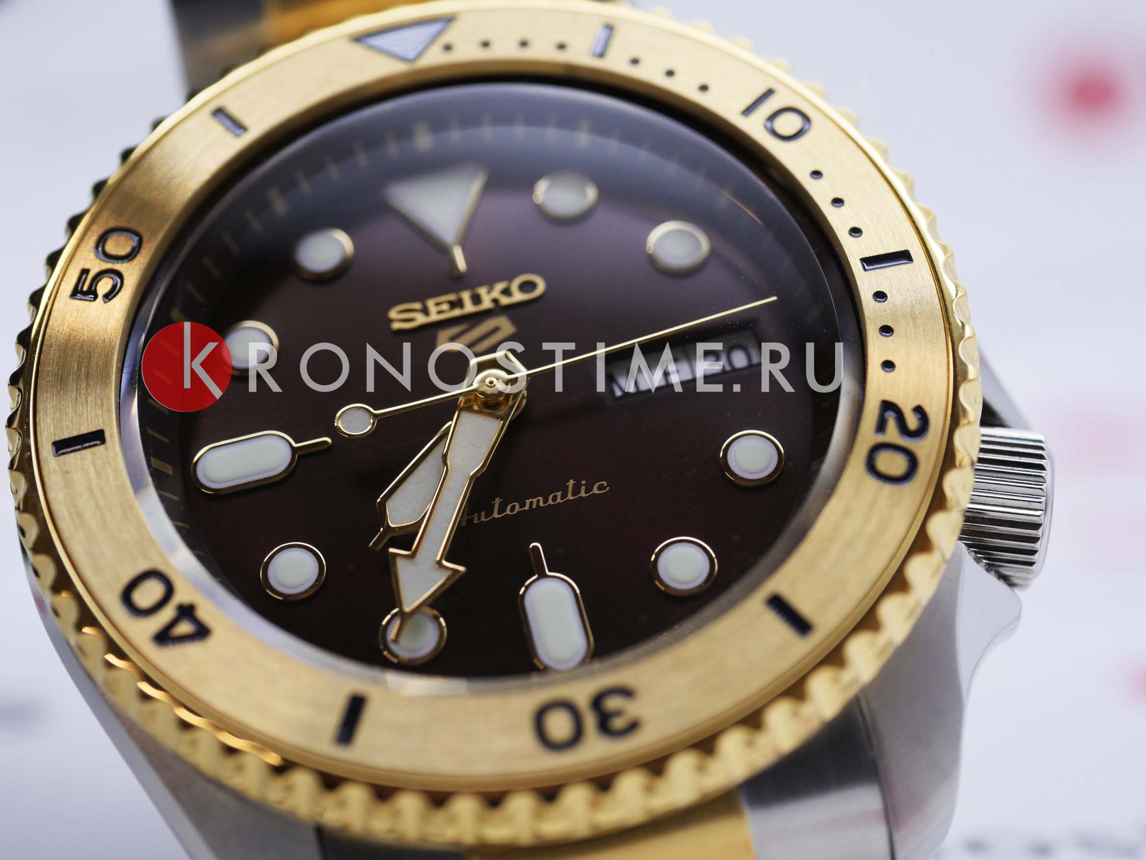 Часы Seiko 5 Sports SRPK24 сочетают в себе элегантный дизайн и надёжность, характерные для японского часового мастерства. Корпус диаметром 42,5 мм выполнен из нержавеющей стали с двухцветным PVD-покрытиемPVDУльтратонкое покрытие наносится в технике вакуумного напыления, сочетает в себе нитрид титана особой прочности со слоем золота или оксида хрома. Несёт в себе декоративную или защитную функцию.: сочетание серебристого и золотистого тонов придаёт часам утончённый вид. Коричневый циферблат защищён минеральным стекломМинеральное стеклоМинеральное стекло представляет собой искусственно выращенный минерал кварца. Такое стекло отличается особой устойчивостью к повреждениям и царапинам. Уступает по некоторым качествам сапфировому стеклу. с повышенной прочностью.