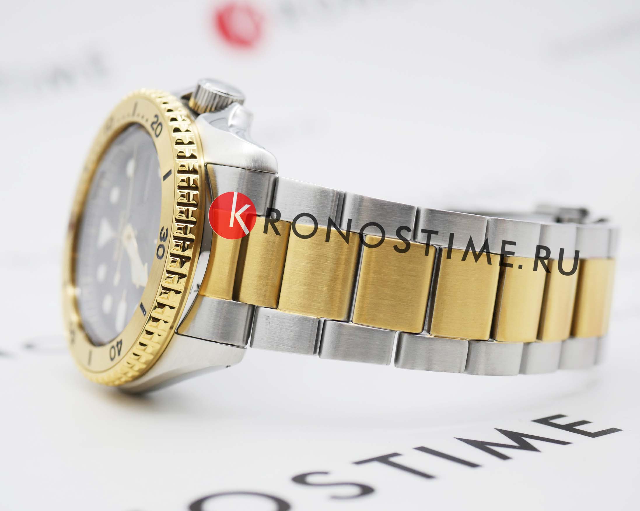 Водозащита 100 метров (10 бар) позволяет использовать часы для плавания и других водных видов спорта. Стальной браслет с двухцветным PVD-покрытиемPVDУльтратонкое покрытие наносится в технике вакуумного напыления, сочетает в себе нитрид титана особой прочности со слоем золота или оксида хрома. Несёт в себе декоративную или защитную функцию. и раскладной застёжкойРаскладная застёжкаТакой тип застёжки используется только на браслетах из металла. Она никогда не раскрывается полностью, происходит разделение на 2 и более частей. Раскладывающая застёжка снизит вероятность потери часов к минимуму. обеспечивает комфортное ношение и надёжную фиксацию на запястье.
