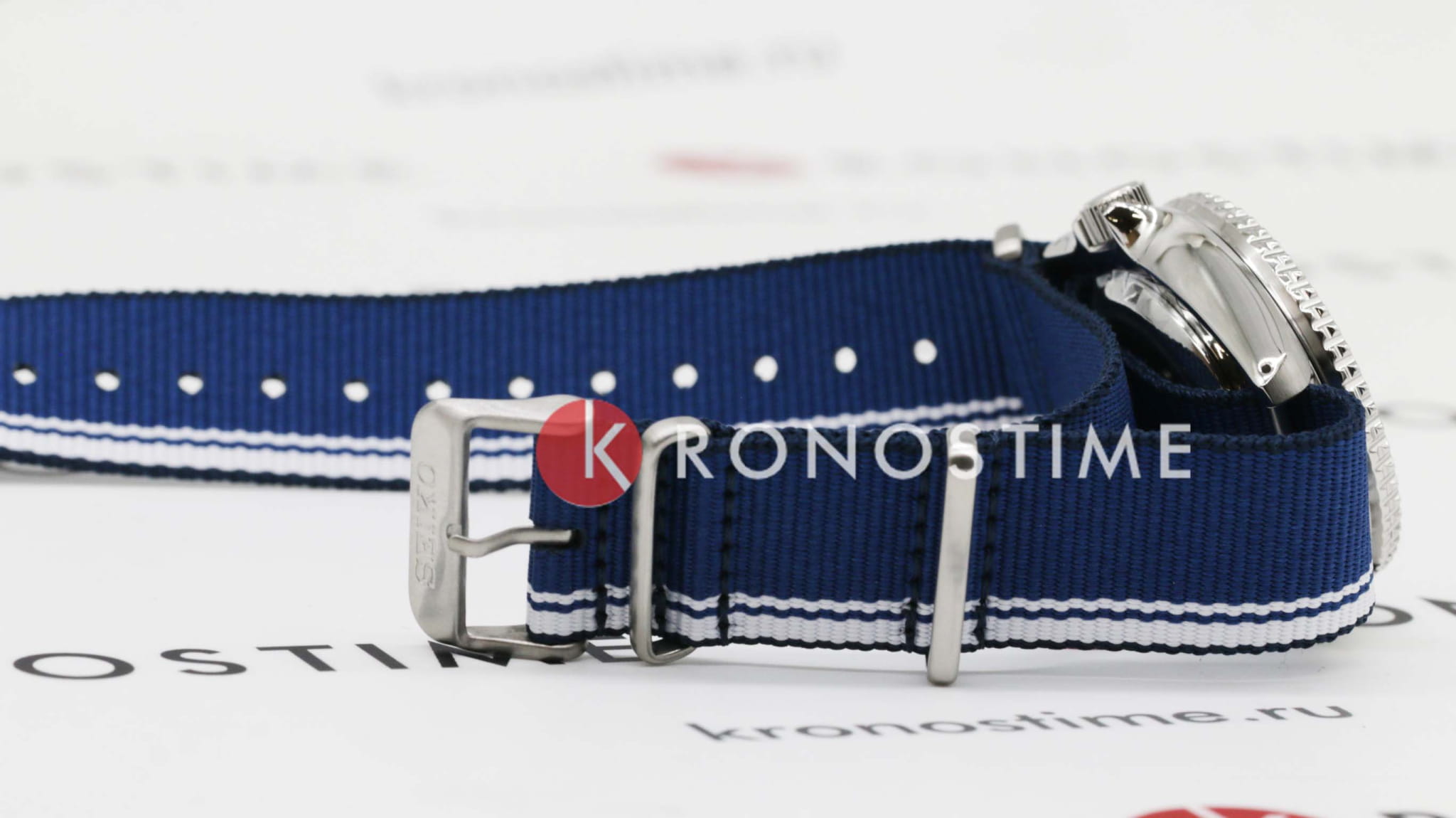 Водозащита 100 метров (10 бар) позволяет использовать часы для плавания и других водных видов спорта. Синий нейлоновый ремешок с белыми полосами и раскладной застёжкойРаскладная застёжкаТакой тип застёжки используется только на браслетах из металла. Она никогда не раскрывается полностью, происходит разделение на 2 и более частей. Раскладывающая застёжка снизит вероятность потери часов к минимуму. обеспечивает комфортное ношение и надёжную фиксацию на запястье.