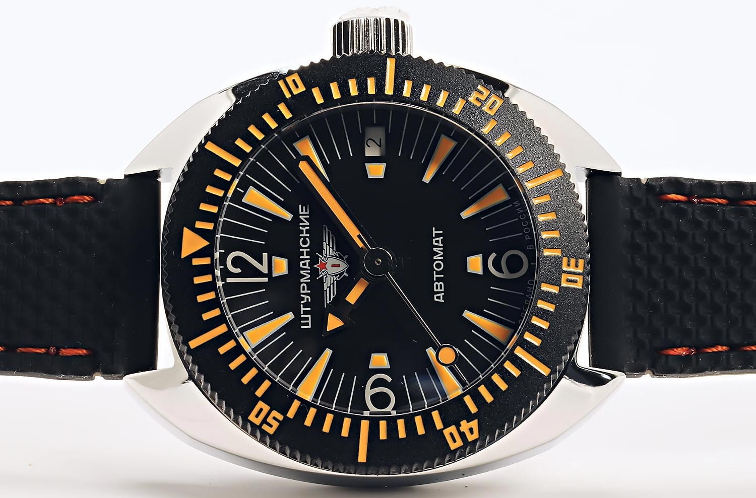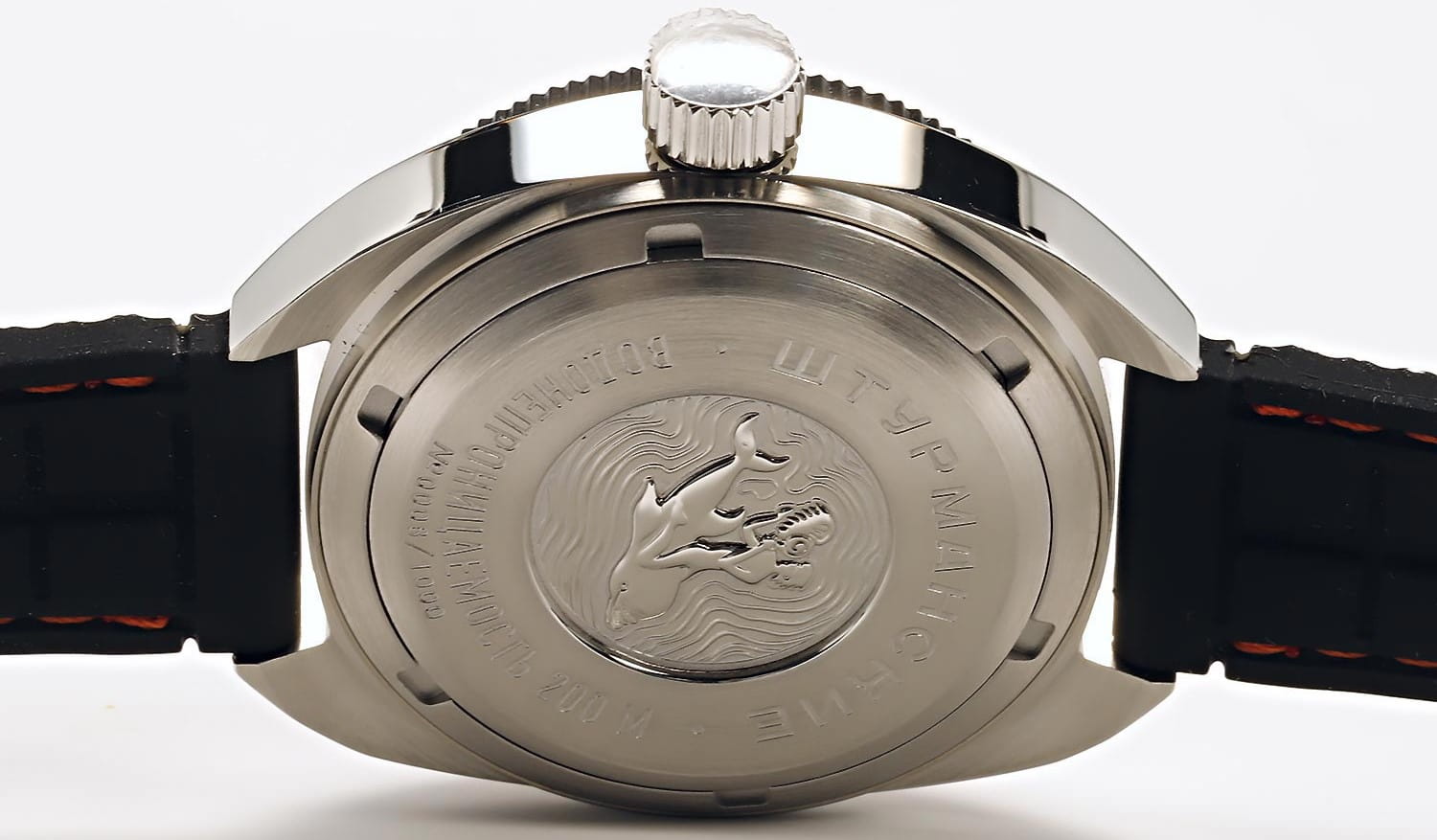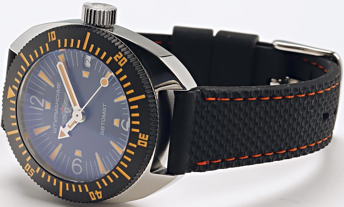 Штурманские мужские российские механические часы с утолщённым сферическим минеральным стекломМинеральное стеклоМинеральное стекло представляет собой искусственно выращенный минерал кварца. Такое стекло отличается особой устойчивостью к повреждениям и царапинам. Уступает по некоторым качествам сапфировому стеклу. Штурманские Амфибия 2416/7771301, механический механизм (автоматический калибр) с высокой точностью. Класс водозащиты: 200 метров, позволит плавать, нырять и заниматься другими водными видами спорта. Корпус часов изготовлен из стали. Силиконовый ремешок на стандартной застёжке. БезельБезельВнешний ободок, закрепляющий стекло. В спортивных часах так называется поворотное кольцо с делениями на циферблате, выполняет роль таймера – замеряет отрезки времени на шкале. Неподвижный безель – элемент декора. Однонаправленно вращающийся безель на дайверских часах позволяет фиксировать моменты погружения и выныривания на поверхность. с PVD-покрытиемPVDУльтратонкое покрытие наносится в технике вакуумного напыления, сочетает в себе нитрид титана особой прочности со слоем золота или оксида хрома. Несёт в себе декоративную или защитную функцию.. Стрелки и метки с люминесцентным покрытиемЛюминесцентное покрытиеПозволяет считывать показания времени в темноте. Производители наносят на стрелки, часовые индексы, безель или поверхность циферблата светонакопительный состав, дающий холодное свечение.. Окошко даты находится в положении 3 часа. Амфибия созданы на основе российского механического калибра с автоматическим подзаводом, 2416.  На задней крышке – как дань исторической модели – рельефные изображения всадника на дельфине.
