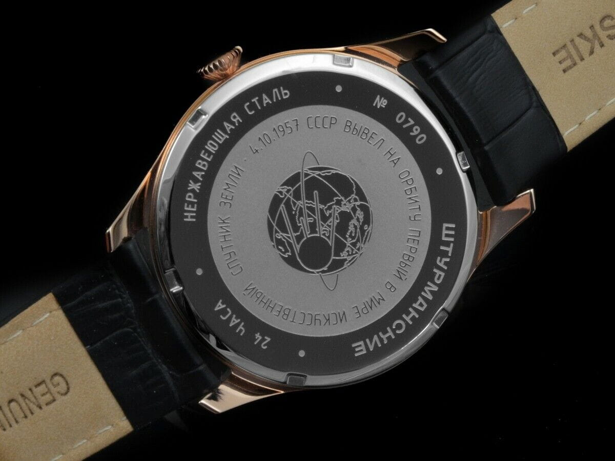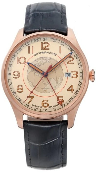 Штурманские мужские российские кварцевые часы с минеральным стекломМинеральное стеклоМинеральное стекло представляет собой искусственно выращенный минерал кварца. Такое стекло отличается особой устойчивостью к повреждениям и царапинам. Уступает по некоторым качествам сапфировому стеклу. Штурманские Наследие Спутник 51524/1079664, кварцевый механизм с высокой точностью. Класс водозащиты: 50 метров, позволит защитить корпус от случайных брызг или капель дождя. Корпус часов изготовлен из стали с PVD-покрытиемPVDУльтратонкое покрытие наносится в технике вакуумного напыления, сочетает в себе нитрид титана особой прочности со слоем золота или оксида хрома. Несёт в себе декоративную или защитную функцию.. Кожаный ремешок на стандартной застёжке. Стрелки и метки с люминесцентным покрытиемЛюминесцентное покрытиеПозволяет считывать показания времени в темноте. Производители наносят на стрелки, часовые индексы, безель или поверхность циферблата светонакопительный состав, дающий холодное свечение.. Индексы стандартной 12-часовой шкалы выполнены в ретро-стиле, светятся в темноте. Вокруг нее расположена вторая шкала – 24-часовая GMT с отдельной стрелкой. Окошко даты находится в положении 3 часа.