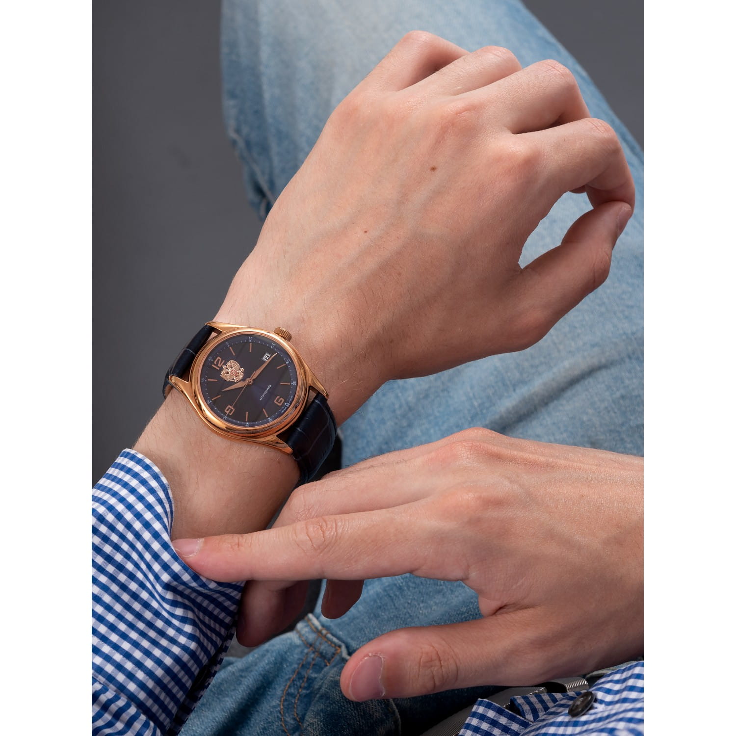 Российские механические часы с автоподзаводом Слава Премьер 1493275/300-8215. Корпус часов выполнен из стали с IP-покрытиемIP-покрытиеМетод ионного напыления. Демонстрирует повышенную устойчивость к истиранию, окислению и химическим веществам. Под воздействием высокого давления и температуры около 1500°C молекулы металла надёжно соединяются с частицами корпуса часов., что придает им долговечность и устойчивость к внешним воздействиям. Сапфировое стеклоСапфировое стеклоПрочный и надёжный материал из кристалла сапфира синтетического происхождения, характеризующийся особой твёрдостью и устойчивостью к царапинам и повреждениям.. Класс водозащиты часов составляет 50 метров, позволит защитить корпус от случайных брызг или капель дождя. Кожаный браслет с стандартной застежкой обеспечивает комфортное ношение и надежную фиксацию на запястье. Эти часы идеально подойдут для повседневного использования, сочетая в себе стиль, надежность и функциональность. Окошко даты находится в положении 3 часа.