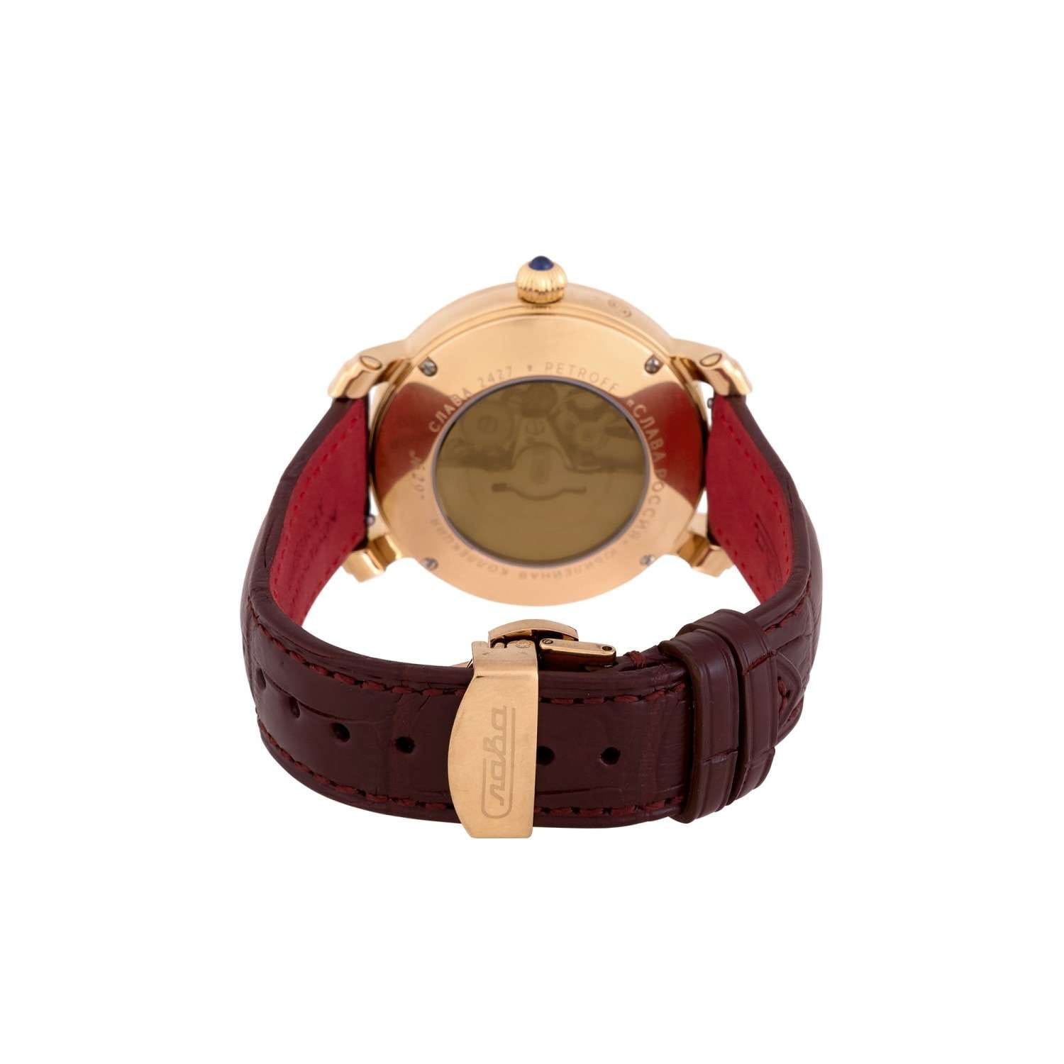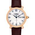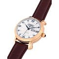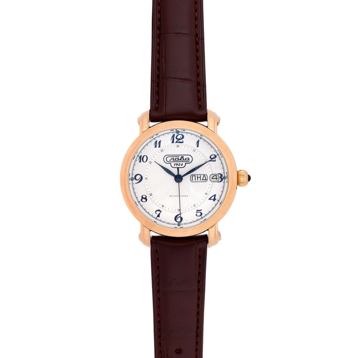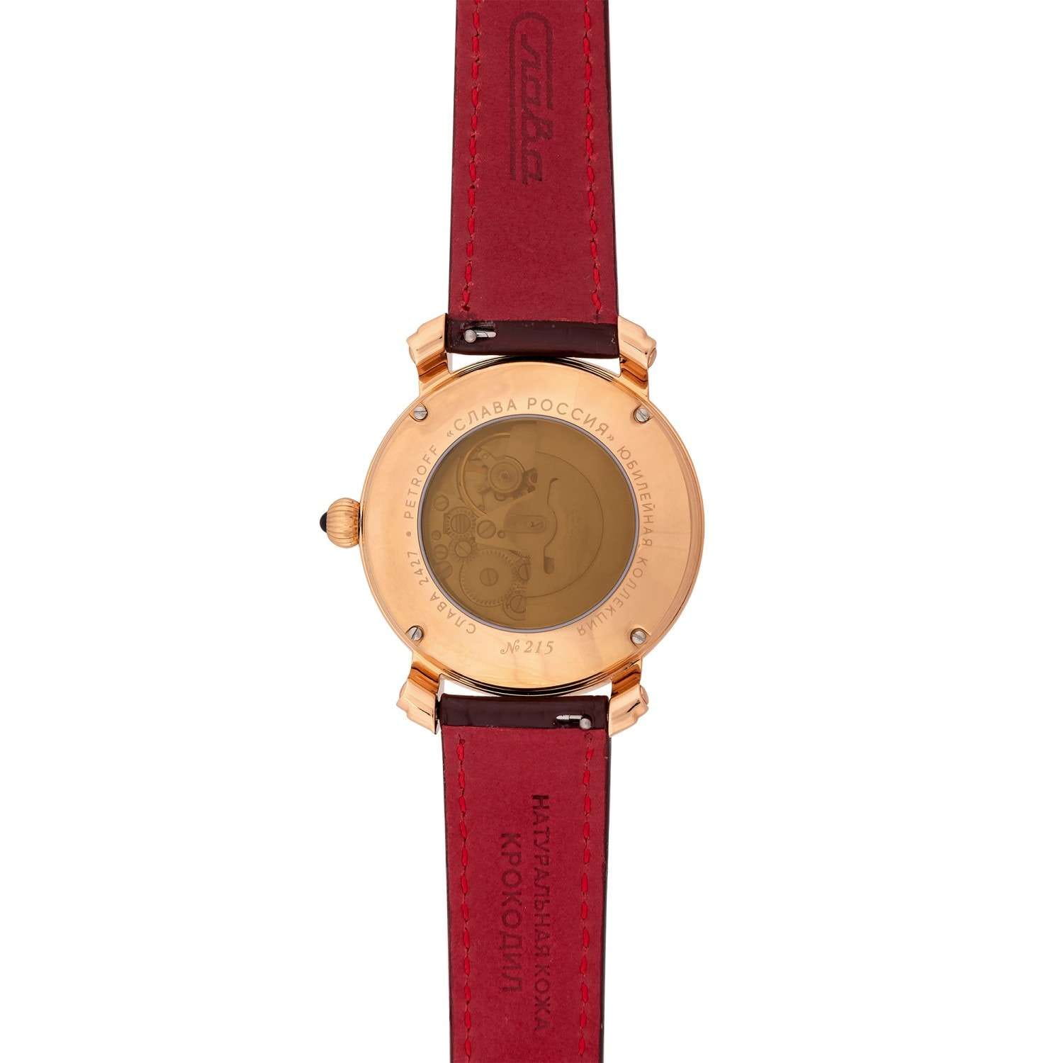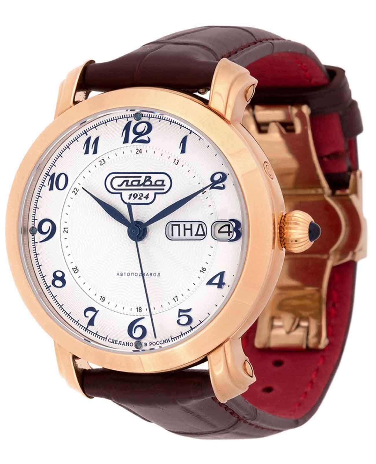 Наручные часы Слава Слава России 2443615/300-2427 — воплощение классического стиля и исключительного качества, произведенные в России. Эта модель из лимитированной коллекции, выпущенной в количестве всего 300 экземпляров, станет великолепным дополнением к вашему образу. Часы оснащены надежным механическим механизмом "Слава 2427" с автоподзаводом, обеспечивающим точный ход и оснащены двойным календарем, что позволяет всегда быть в курсе текущей даты. Корпус из нержавеющей стали с золотистым PVDPVDУльтратонкое покрытие наносится в технике вакуумного напыления, сочетает в себе нитрид титана особой прочности со слоем золота или оксида хрома. Несёт в себе декоративную или защитную функцию. покрытием диаметром 41 мм и толщиной 14,2 мм отличается высокой прочностью и водозащитой до 5 ATM. Серебристый циферблат с арабскими цифрами защищен сапфировым стекломСапфировое стеклоПрочный и надёжный материал из кристалла сапфира синтетического происхождения, характеризующийся особой твёрдостью и устойчивостью к царапинам и повреждениям., устойчивым к царапинам, что позволяет надолго сохранить безупречный вид часов. На 3 часах расположено окошко с указателем даты и дня недели. Кожаный ремень из крокодила с застежкой «бабочка»Застёжка "бабочка"Такой вид застёжки дополняется предохранителями, помогающими избежать случайного раскрытия браслета. Обладают изящным исполнением. добавляет элегантности и комфорта, создавая ощущение роскоши и изысканности. Эта модель станет идеальным выбором для тех, кто ценит традиции и высокое качество в сочетании с современным дизайном.