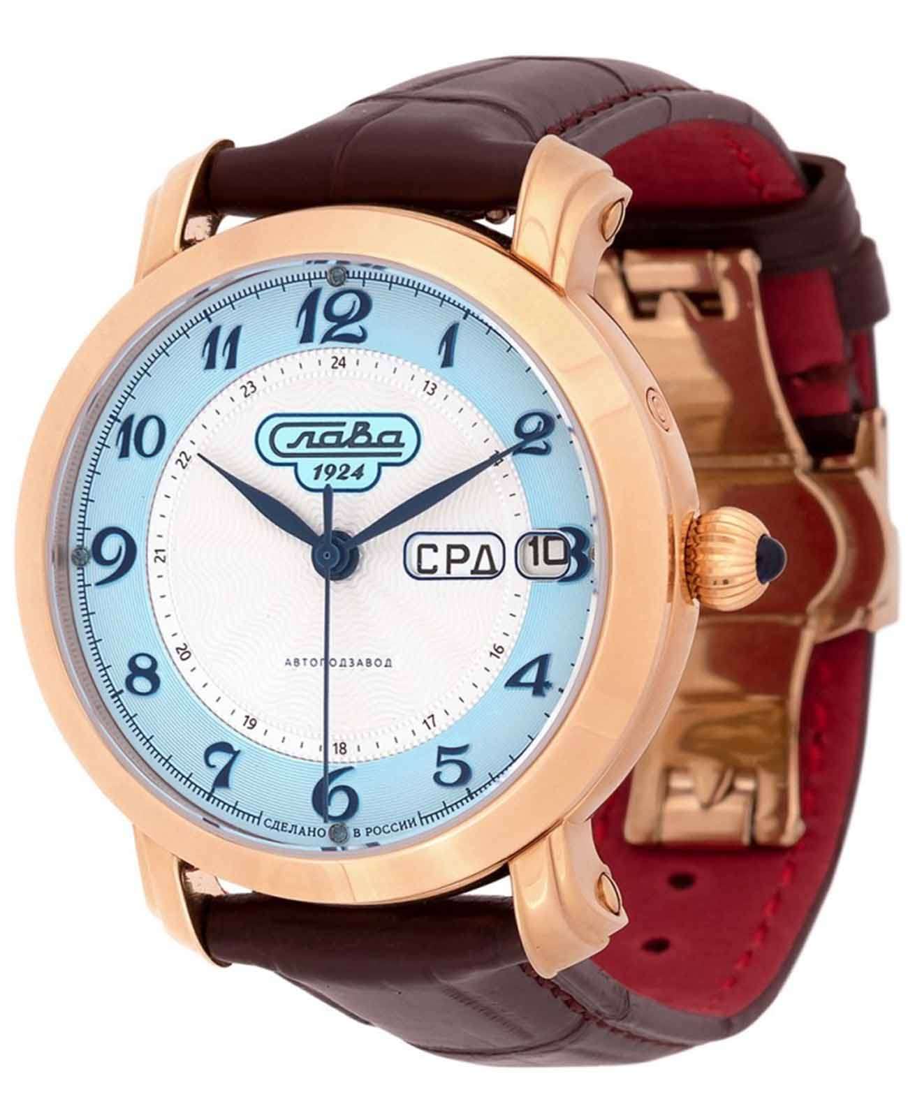 Наручные часы Слава Слава России 2443616/300-2427 — воплощение классического стиля и исключительного качества, произведенные в России. Эта модель из лимитированной коллекции, выпущенной в количестве всего 300 экземпляров, станет великолепным дополнением к вашему образу. Часы оснащены надежным механическим механизмом "Слава 2427" с автоподзаводом, обеспечивающим точный ход и оснащены двойным календарем, что позволяет всегда быть в курсе текущей даты. Корпус из нержавеющей стали с золотистым PVDPVDУльтратонкое покрытие наносится в технике вакуумного напыления, сочетает в себе нитрид титана особой прочности со слоем золота или оксида хрома. Несёт в себе декоративную или защитную функцию. покрытием диаметром 41 мм и толщиной 14,2 мм отличается высокой прочностью и водозащитой до 5 ATM. Серебристо-голубой циферблат с арабскими цифрами защищен сапфировым стекломСапфировое стеклоПрочный и надёжный материал из кристалла сапфира синтетического происхождения, характеризующийся особой твёрдостью и устойчивостью к царапинам и повреждениям., устойчивым к царапинам, что позволяет надолго сохранить безупречный вид часов. На 3 часах расположено окошко с указателем даты и дня недели. Кожаный ремень из крокодила с застежкой «бабочка»Застёжка "бабочка"Такой вид застёжки дополняется предохранителями, помогающими избежать случайного раскрытия браслета. Обладают изящным исполнением. добавляет элегантности и комфорта, создавая ощущение роскоши и изысканности. Эта модель станет идеальным выбором для тех, кто ценит традиции и высокое качество в сочетании с современным дизайном.