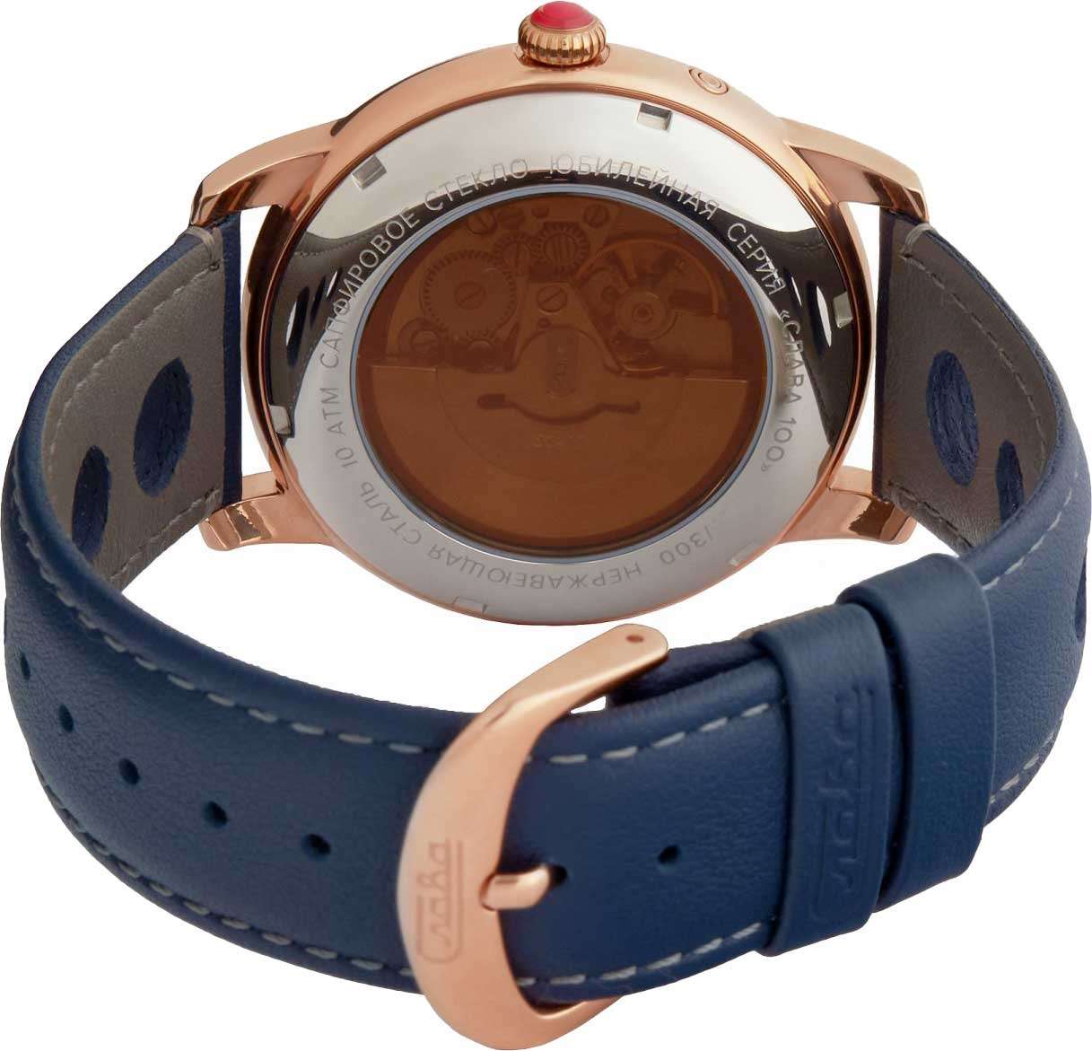 Часы Слава Юбилейные 2603673/300-2427 представляют собой воплощение российского часового искусства, сочетая в себе традиции и современные технологии. Эти механические часы с автоподзаводом оснащены калибром «Слава 2427», который обеспечивает надежную и точную работу. Корпус из высококачественной стали с IP-покрытиемIP-покрытиеМетод ионного напыления. Демонстрирует повышенную устойчивость к истиранию, окислению и химическим веществам. Под воздействием высокого давления и температуры около 1500°C молекулы металла надёжно соединяются с частицами корпуса часов. диаметром 44 мм и толщиной 14,5 мм придает часам солидность и долговечность. Циферблат выполнен в благородном синем цвете и оформлен арабскими цифрами, обеспечивая удобство чтения времени. Прочное выпуклое сапфировое стеклоСапфировое стеклоПрочный и надёжный материал из кристалла сапфира синтетического происхождения, характеризующийся особой твёрдостью и устойчивостью к царапинам и повреждениям. защищает циферблат от царапин и повреждений. Особенностью модели является наличие календаря, отображающего число и день недели в положении 3 часа. Стрелки с люминесцентным покрытиемЛюминесцентное покрытиеПозволяет считывать показания времени в темноте. Производители наносят на стрелки, часовые индексы, безель или поверхность циферблата светонакопительный состав, дающий холодное свечение., что облегчает чтение времени даже в условиях слабого освещения. Часы обладают водозащитой уровня 100WR, что делает их подходящими для повседневного ношения и активного образа жизни. Кожаный ремешок с классической застежкой добавляет модели изысканности и комфорта в носке. Эта модель представлена в лимитированной серии из 300 экземпляров, что делает её не только надежным функциональным аксессуаром, но и ценным предметом для коллекционеров. Прозрачная задняя крышка позволяет наблюдать за работой механизма, который включает в себя 25 камней и имеет частоту 18000 полуколебаний в час. Запас хода составляет до 40 часов, а противоударное устройство оси баланса обеспечивает дополнительную надежность.