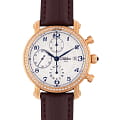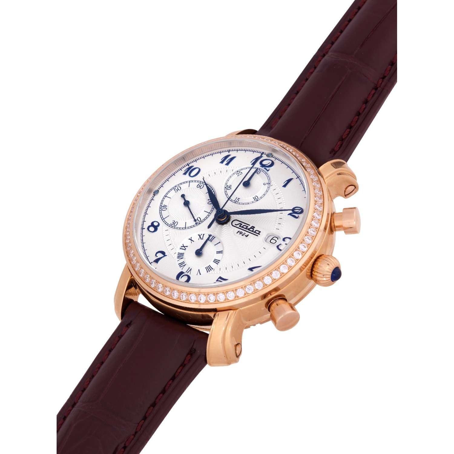Российские механические наручные часы-хронографХронографФункция позволяет измерять отрезки времени с особой точностью: часы, минуты, секунды. Верным признаком хронографа является наличие на циферблате 3 дополнительных окошек-счётчиков. с секундомеромСекундомерСекундоме́р — прибор, способный измерять интервалы времени с точностью до долей секунды. Слава Слава России 7453618/300-7750-68 — воплощение классического стиля и исключительного качества, произведенные в России. Эта модель из лимитированной коллекции, выпущенной в количестве всего 300 экземпляров, станет великолепным дополнением к вашему образу. Часы оснащены надежным механическим механизмом Valjoux ETA 7750 с автоподзаводом, обеспечивающим точный ход. Корпус из нержавеющей стали с золотистым PVDPVDУльтратонкое покрытие наносится в технике вакуумного напыления, сочетает в себе нитрид титана особой прочности со слоем золота или оксида хрома. Несёт в себе декоративную или защитную функцию.-покрытием диаметром 41 мм и толщиной 14,2 мм отличается высокой прочностью и водозащитой до 5 ATM. БезельБезельВнешний ободок, закрепляющий стекло. В спортивных часах так называется поворотное кольцо с делениями на циферблате, выполняет роль таймера – замеряет отрезки времени на шкале. Неподвижный безель – элемент декора. Однонаправленно вращающийся безель на дайверских часах позволяет фиксировать моменты погружения и выныривания на поверхность. часов с вставками из камней циркона. Серебристый циферблат с арабскими цифрами защищен сапфировым стекломСапфировое стеклоПрочный и надёжный материал из кристалла сапфира синтетического происхождения, характеризующийся особой твёрдостью и устойчивостью к царапинам и повреждениям., устойчивым к царапинам, что позволяет надолго сохранить безупречный вид часов. На 3 часах расположено окошко с указателем даты и дня недели. Кожаный ремень с застежкой «бабочка»Застёжка "бабочка"Такой вид застёжки дополняется предохранителями, помогающими избежать случайного раскрытия браслета. Обладают изящным исполнением. добавляет элегантности и комфорта, создавая ощущение роскоши и изысканности. Эта модель станет идеальным выбором для тех, кто ценит традиции и высокое качество в сочетании с современным дизайном.
