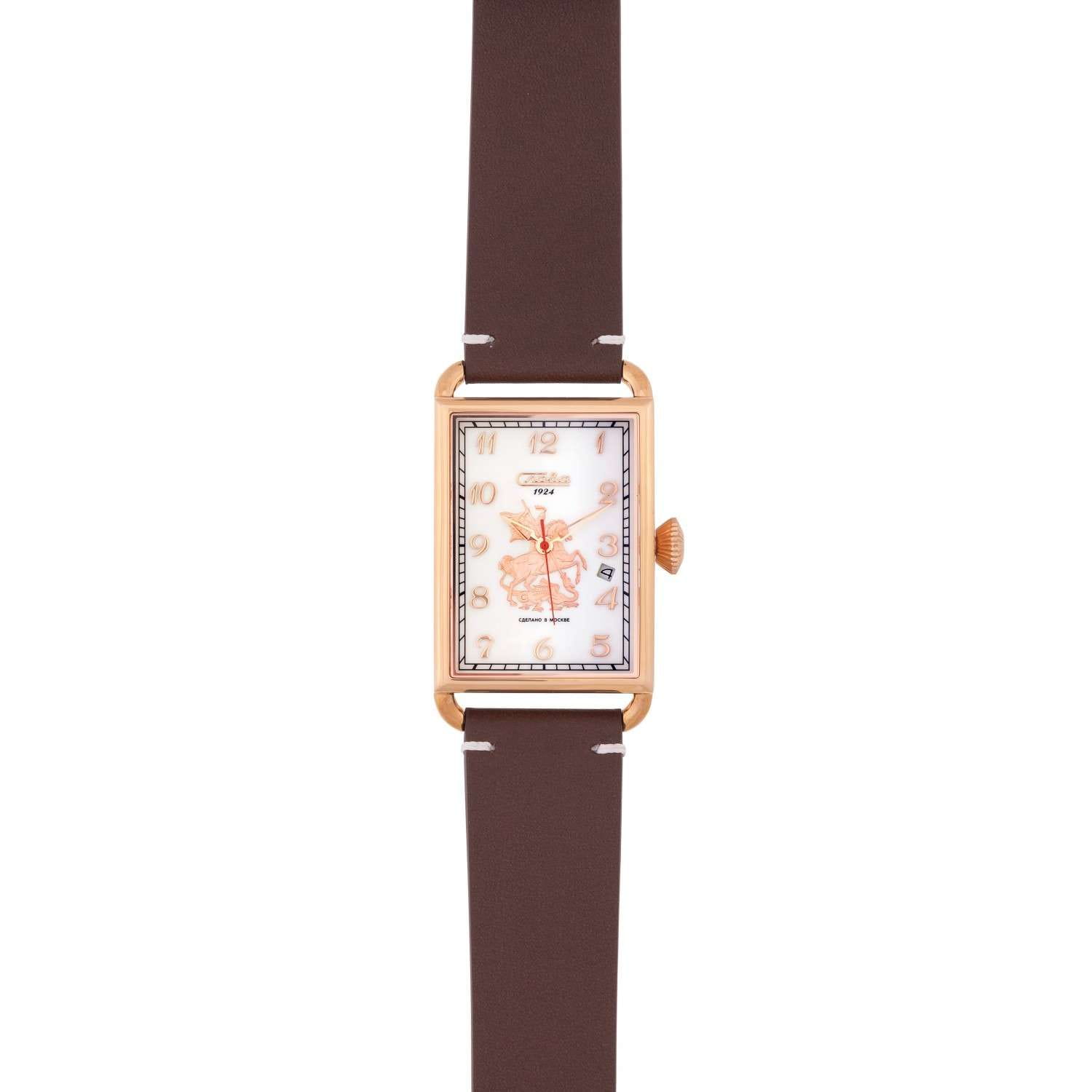 Часы Слава Москва 8703785/300-2414 — это воплощение элегантности и стиля, которое станет идеальным дополнением к вашему деловому гардеробу. Созданные в России, они оснащены надежным механическим механизмом калибра Слава 2414. Корпус выполнен из высококачественной стали с PVDPVDУльтратонкое покрытие наносится в технике вакуумного напыления, сочетает в себе нитрид титана особой прочности со слоем золота или оксида хрома. Несёт в себе декоративную или защитную функцию. покрытием, что обеспечивает долговечность и изысканный внешний вид. Белый циферблат украшен изображением Георгия Победоносца и защищен прочным сапфировым стекломСапфировое стеклоПрочный и надёжный материал из кристалла сапфира синтетического происхождения, характеризующийся особой твёрдостью и устойчивостью к царапинам и повреждениям., которое устойчиво к царапинам. Арабские цифры и окошко даты, расположенное между отметками 3 и 4 часа, добавляют функциональности и удобства в использовании. Задняя крышка, крепящаяся на 4 винтах, украшена надписью «Москва», подчеркивая уникальность и оригинальность модели. Кожаный ремешок с классической застежкой и системой быстрой замены не только обеспечивает комфорт, но и позволяет легко менять его по вашему желанию. Часы обладают водозащитой 50WR, что делает их подходящими для ежедневного ношения. Компактные габариты и вес в 70 грамм делают их удобными и практически незаметными на запястье. Эта лимитированная серия выпущена в количестве всего 500 экземпляров, что придает особую ценность и эксклюзивность вашему выбору. Часы поставляются в стильной подарочной упаковке, что делает их отличным подарком для ценителей высокого качества и утонченного дизайна.