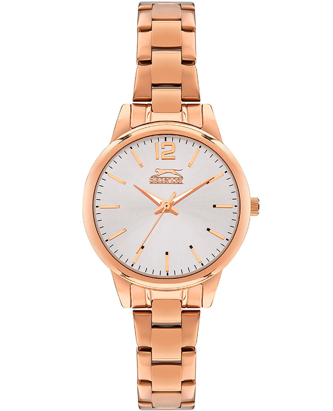 Женские наручные часы Slazenger SL.09.2016.3.04 из новой коллекции бренда сочетают в себе элегантность и современные технологии. Модель имеет круглый корпус диаметром 32 мм, изготовленный из суперметалла с IP-покрытиемIP-покрытиеМетод ионного напыления. Демонстрирует повышенную устойчивость к истиранию, окислению и химическим веществам. Под воздействием высокого давления и температуры около 1500°C молекулы металла надёжно соединяются с частицами корпуса часов. розового оттенка, что обеспечивает высокую устойчивость к внешним воздействиям и привлекательный внешний вид . Браслет выполнен из металла с раскладной застежкойРаскладной замокДанный вариант застежки используется только на часах с металлическим браслетом. Отличительная особенность такого крепления в том, что длина браслета становится универсальной и вы можете самостоятельно отрегулировать нужный вам размер – застежка просто двигается по браслету часов., обеспечивающей комфортное ношение и надежную фиксацию на запястье. Циферблат защищен прочным минеральным стекломМинеральное стеклоМинеральное стекло представляет собой искусственно выращенный минерал кварца. Такое стекло отличается особой устойчивостью к повреждениям и царапинам. Уступает по некоторым качествам сапфировому стеклу., устойчивым к царапинам. Часы оснащены точным кварцевым механизмом японского производства, гарантирующим стабильную работу и точность хода. Модель обладает водонепроницаемостью до 5 атмосфер (WR 50), что позволяет использовать их в условиях легкого контакта с водой, например, при мытье рук или хождении под мелким дождем, однако не рекомендуется для плавания или дайвинга. Вес часов составляет 69 грамм, что делает их удобными для повседневного использования.