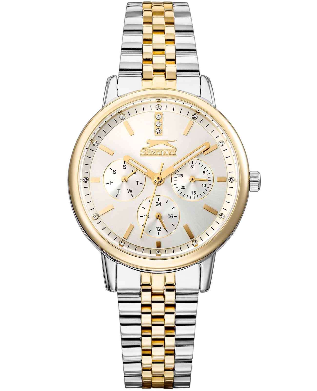 Часы Slazenger SL.09.2050.4.05 — это элегантное сочетание стиля и функциональности, созданное специально для женщин. Их изысканный серебристый циферблат и корпус из суперметалла придают часам современный и утонченный вид, а безельБезельВнешний ободок, закрепляющий стекло. В спортивных часах так называется поворотное кольцо с делениями на циферблате, выполняет роль таймера – замеряет отрезки времени на шкале. Неподвижный безель – элемент декора. Однонаправленно вращающийся безель на дайверских часах позволяет фиксировать моменты погружения и выныривания на поверхность. из суперметалла с IP-покрытиемIP-покрытиеМетод ионного напыления. Демонстрирует повышенную устойчивость к истиранию, окислению и химическим веществам. Под воздействием высокого давления и температуры около 1500°C молекулы металла надёжно соединяются с частицами корпуса часов. отлично его дополняет. Внутри скрыт надежный кварцевый механизм, который гарантирует точность и долговечность. Минеральное стеклоМинеральное стеклоМинеральное стекло представляет собой искусственно выращенный минерал кварца. Такое стекло отличается особой устойчивостью к повреждениям и царапинам. Уступает по некоторым качествам сапфировому стеклу. защищает часы от царапин, а украшение из фианитов добавляет изысканный акцент. Люминесцентное покрытиеЛюминесцентное покрытиеПозволяет считывать показания времени в темноте. Производители наносят на стрелки, часовые индексы, безель или поверхность циферблата светонакопительный состав, дающий холодное свечение. на стрелках позволяют легко считывать время даже в темноте. Функциональность часов дополнена 24-часовым указателем времени, календарем даты и дня недели. Браслет из суперметалла с частичным IP-покрытиемIP-покрытиеМетод ионного напыления. Демонстрирует повышенную устойчивость к истиранию, окислению и химическим веществам. Под воздействием высокого давления и температуры около 1500°C молекулы металла надёжно соединяются с частицами корпуса часов. и раскладной застёжкойРаскладная застёжкаТакой тип застёжки используется только на браслетах из металла. Она никогда не раскрывается полностью, происходит разделение на 2 и более частей. Раскладывающая застёжка снизит вероятность потери часов к минимуму. подчеркивает женственность дизайна и обеспечивает комфорт в носке. Диаметр корпуса составляет 35 мм, а толщина — 9 мм, что делает их идеальным аксессуаром для любой стильной женщины. Водозащита уровня 3 ATM позволяет не беспокоиться о случайных брызгах.
