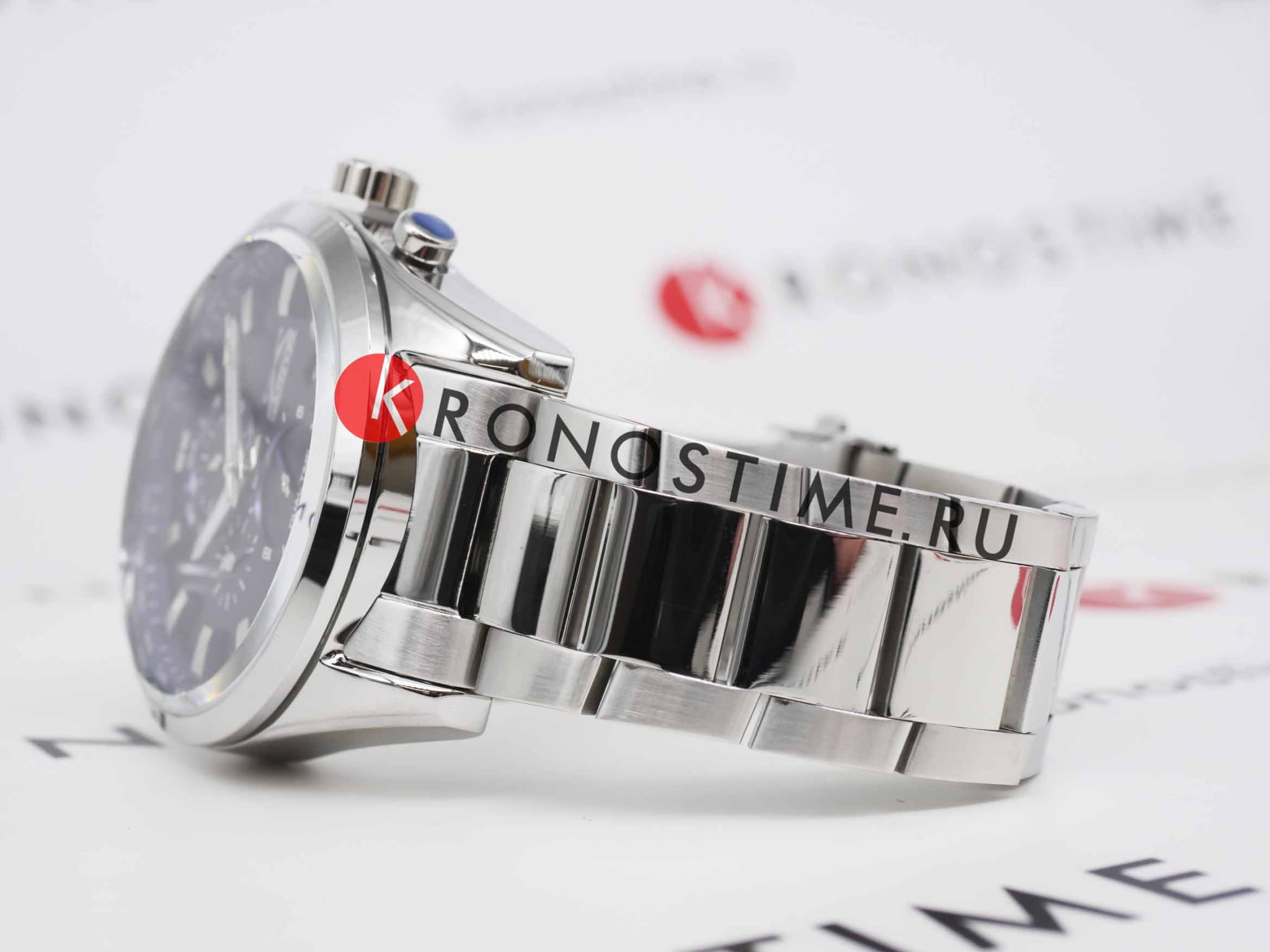 Циферблат тёмно-синего цвета декорирован стрелками с люминесцентным покрытиемЛюминесцентное покрытиеПозволяет считывать показания времени в темноте. Производители наносят на стрелки, часовые индексы, безель или поверхность циферблата светонакопительный состав, дающий холодное свечение., которые обеспечивают читаемость времени даже в условиях недостаточной освещенности. Для защиты используется минеральное стеклоМинеральное стеклоМинеральное стекло представляет собой искусственно выращенный минерал кварца. Такое стекло отличается особой устойчивостью к повреждениям и царапинам. Уступает по некоторым качествам сапфировому стеклу., обеспечивающее прочную защиту от царапин.