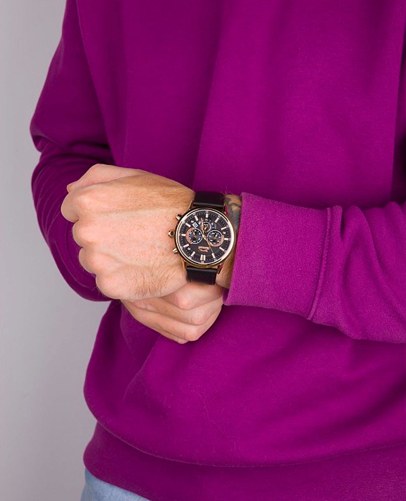 Мужские наручные часы Slazenger SL.09.2062.2.05 сочетают в себе классический дизайн и функциональность для повседневного использования. Модель обладает круглым корпусом диаметром 45 мм, изготовленным из суперметалла с IP-покрытиемIP-покрытиеМетод ионного напыления. Демонстрирует повышенную устойчивость к истиранию, окислению и химическим веществам. Под воздействием высокого давления и температуры около 1500°C молекулы металла надёжно соединяются с частицами корпуса часов., что обеспечивает высокую устойчивость к внешним воздействиям. Браслет выполнен из кожи черного цвета на стандартной застежке, что гарантирует комфортное ношение. Циферблат представлен в черном цвете и украшен логотипом бренда; метки выполнены в виде штрихов. Для защиты используется минеральное стеклоМинеральное стеклоМинеральное стекло представляет собой искусственно выращенный минерал кварца. Такое стекло отличается особой устойчивостью к повреждениям и царапинам. Уступает по некоторым качествам сапфировому стеклу., обеспечивающее прочную защиту от царапин. Стрелки и метки имеют люминесцентное покрытиеЛюминесцентное покрытиеПозволяет считывать показания времени в темноте. Производители наносят на стрелки, часовые индексы, безель или поверхность циферблата светонакопительный состав, дающий холодное свечение., что позволяет легко читать время даже в условиях недостаточной освещенности. Часы работают на японском кварцевом механизме, который обеспечивает высокую точность хода без необходимости подзаводки. Модель также оснащена дополнительными функциями: индикатор дня недели, даты и времени в 24-часовом формате, а также функцией второго часового поясаВторой часовой поясФункция, позволяющая отображать время двух часовых поясов одновременно., делая ее идеальной для путешествий и деловых встреч. Водонепроницаемость часов достигает 5 атмосфер (50 метров), что позволяет использовать их при легком контакте с водой, например, во время мытья рук, однако не рекомендуется для плавания или дайвинга.