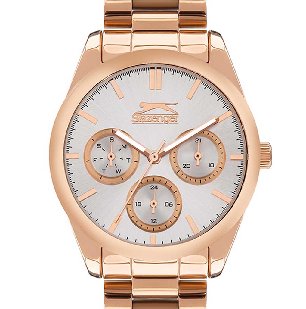 Женские наручные часы Slazenger SL.09.2063.4.02 сочетают в себе классический дизайн и высокое качество исполнения. Модель обладает круглым корпусом диаметром 36 мм, изготовленным из суперметалла с золотистым IP-покрытиемIP-покрытиеМетод ионного напыления. Демонстрирует повышенную устойчивость к истиранию, окислению и химическим веществам. Под воздействием высокого давления и температуры около 1500°C молекулы металла надёжно соединяются с частицами корпуса часов. покрытием, что обеспечивает устойчивость к внешним воздействиям. Браслет выполнен из суперметалла с IP-покрытиемIP-покрытиеМетод ионного напыления. Демонстрирует повышенную устойчивость к истиранию, окислению и химическим веществам. Под воздействием высокого давления и температуры около 1500°C молекулы металла надёжно соединяются с частицами корпуса часов. на раскладной застёжкеРаскладная застёжкаТакой тип застёжки используется только на браслетах из металла. Она никогда не раскрывается полностью, происходит разделение на 2 и более частей. Раскладывающая застёжка снизит вероятность потери часов к минимуму.. Белый циферблат украшен логотипом бренда и метками времени. Имеются дополнительные малые циферблаты для отображения даты, дня недели и текущего времени в 24-часовом формате. Для защиты используется минеральное стеклоМинеральное стеклоМинеральное стекло представляет собой искусственно выращенный минерал кварца. Такое стекло отличается особой устойчивостью к повреждениям и царапинам. Уступает по некоторым качествам сапфировому стеклу., обеспечивающее прочную защиту от царапин. Стрелки и метки имеют люминесцентное покрытиеЛюминесцентное покрытиеПозволяет считывать показания времени в темноте. Производители наносят на стрелки, часовые индексы, безель или поверхность циферблата светонакопительный состав, дающий холодное свечение., что позволяет легко читать время в темноте. Часы работают на японском кварцевом механизме, который обеспечивает точность хода без необходимости подзаводки. Водонепроницаемость часов составляет 3 атмосферы (WR30), что позволяет защитить корпус от случайных брызг или капель дождя.