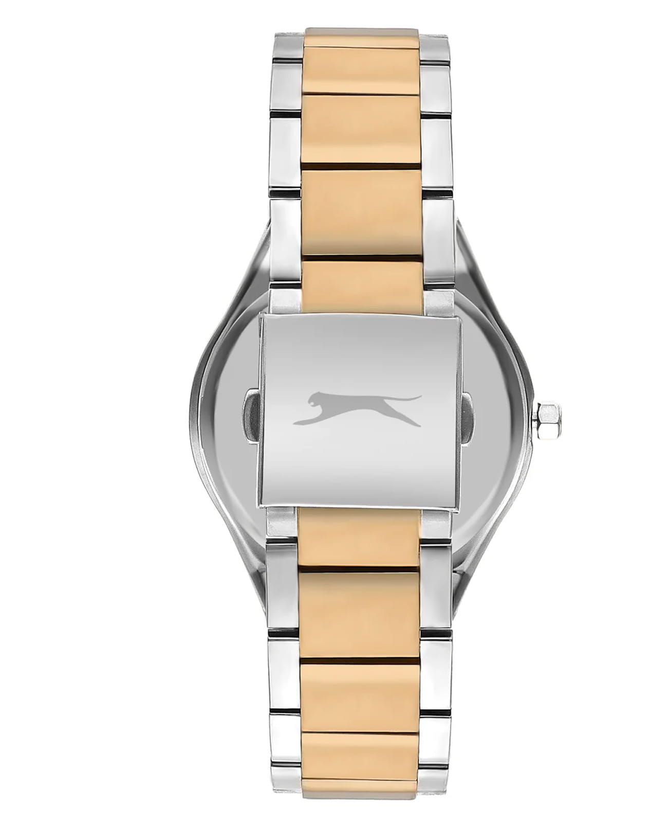 Женские наручные часы Slazenger SL.09.2075.3.03 сочетают в себе элегантный дизайн и функциональность. Модель обладает круглым корпусом диаметром 34 мм, изготовленным из суперметалла, что обеспечивает высокую устойчивость к внешним воздействиям. Браслет выполнен из того же материала с частичным IP-покрытиемIP-покрытиеМетод ионного напыления. Демонстрирует повышенную устойчивость к истиранию, окислению и химическим веществам. Под воздействием высокого давления и температуры около 1500°C молекулы металла надёжно соединяются с частицами корпуса часов. на раскладной застежкойРаскладной замокДанный вариант застежки используется только на часах с металлическим браслетом. Отличительная особенность такого крепления в том, что длина браслета становится универсальной и вы можете самостоятельно отрегулировать нужный вам размер – застежка просто двигается по браслету часов., гарантирующем комфортное ношение и безопасность. Для защиты используется минеральное стеклоМинеральное стеклоМинеральное стекло представляет собой искусственно выращенный минерал кварца. Такое стекло отличается особой устойчивостью к повреждениям и царапинам. Уступает по некоторым качествам сапфировому стеклу., обеспечивающее прочную защиту от царапин. Часы работают на кварцевом механизме, что гарантирует точное время без необходимости подзаводки. Водонепроницаемость достигает 3 атмосфер (WR30), что позволяет использовать их при контакте с брызгами воды, однако не рекомендуется для плавания или дайвинга.