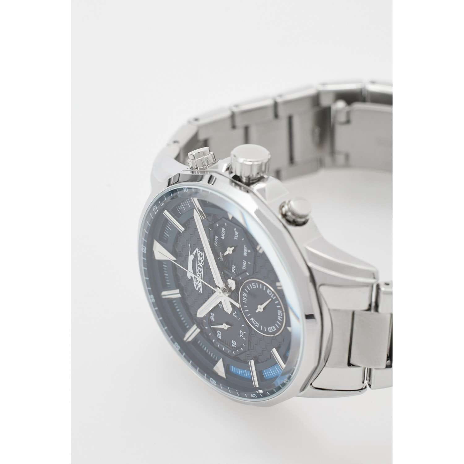 Стильные мужские наручные часы Slazenger SL.09.2216.2.04 станут идеальным аксессуаром для современного мужчины. Этот британский бренд славится своим качеством и надежностью, а данная модель не является исключением. Часы оснащены кварцевым механизмом, что обеспечивает точность хода и долговечность использования. Корпус часов выполнен из металла, а прочное минеральное стеклоМинеральное стеклоМинеральное стекло представляет собой искусственно выращенный минерал кварца. Такое стекло отличается особой устойчивостью к повреждениям и царапинам. Уступает по некоторым качествам сапфировому стеклу. защищает циферблат от царапин и повреждений. Элегантный металлический браслет серебристого цвета снабжен удобной раскладной застёжкойРаскладная застёжкаТакой тип застёжки используется только на браслетах из металла. Она никогда не раскрывается полностью, происходит разделение на 2 и более частей. Раскладывающая застёжка снизит вероятность потери часов к минимуму., что гарантирует комфортное ношение на запястье. Ширина браслета составляет 22 мм, что придает часам солидный вид. Диаметр корпуса равен 45 мм, а толщина 12 мм, что делает эту модель заметной, но в то же время не громоздкой. Водозащита уровня WR 50 позволяет использовать часы в повседневной жизни, не беспокоясь о случайных попаданиях воды. Стрелки снабжены люминесцентным покрытиемЛюминесцентное покрытиеПозволяет считывать показания времени в темноте. Производители наносят на стрелки, часовые индексы, безель или поверхность циферблата светонакопительный состав, дающий холодное свечение., что позволяет легко считывать время в темноте. Функциональные возможности часов включают отображение даты, дня недели и времени в 24-часовом формате на дополнительных малых циферблатах. Это делает модель не только стильной, но и практичной в использовании.