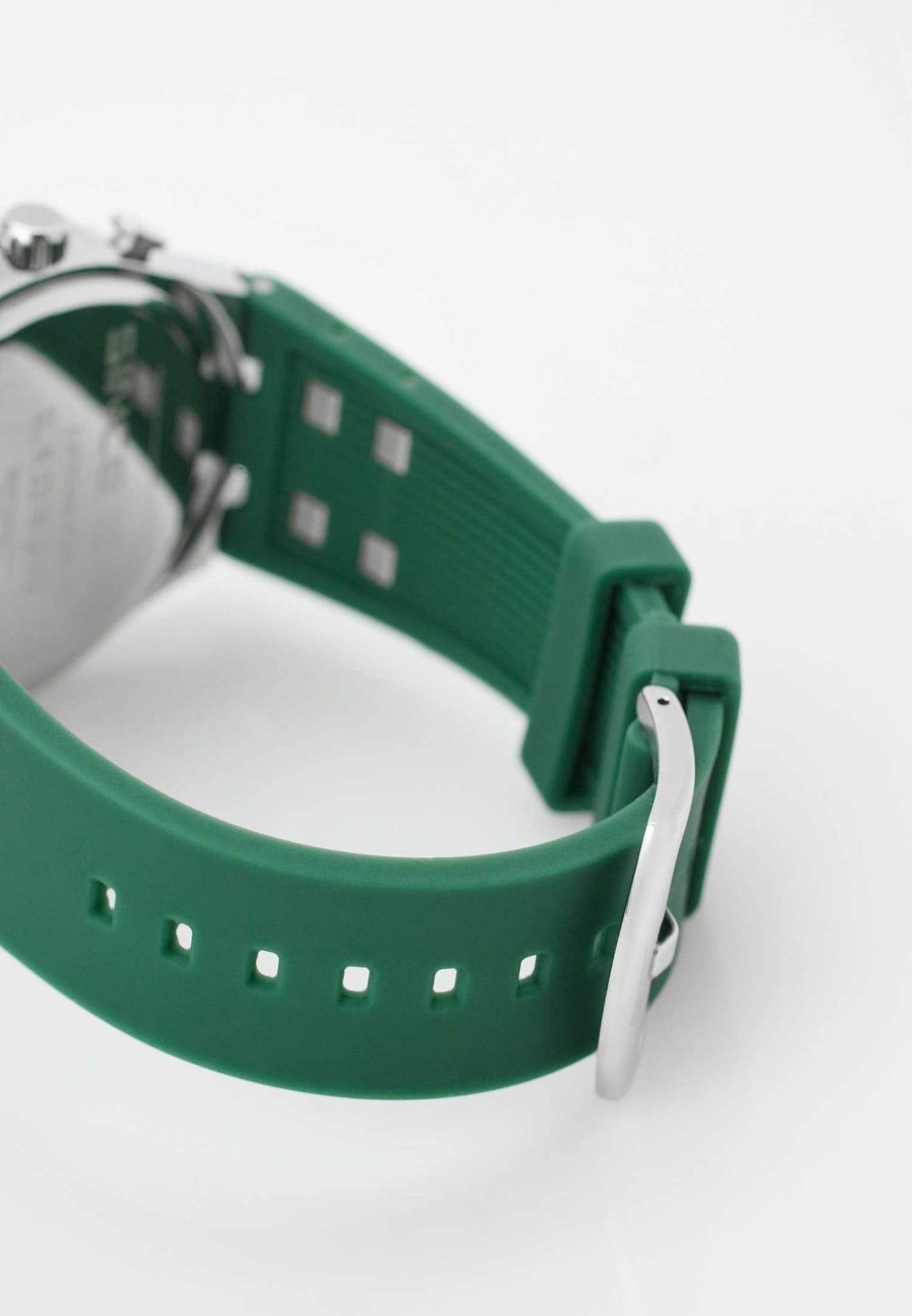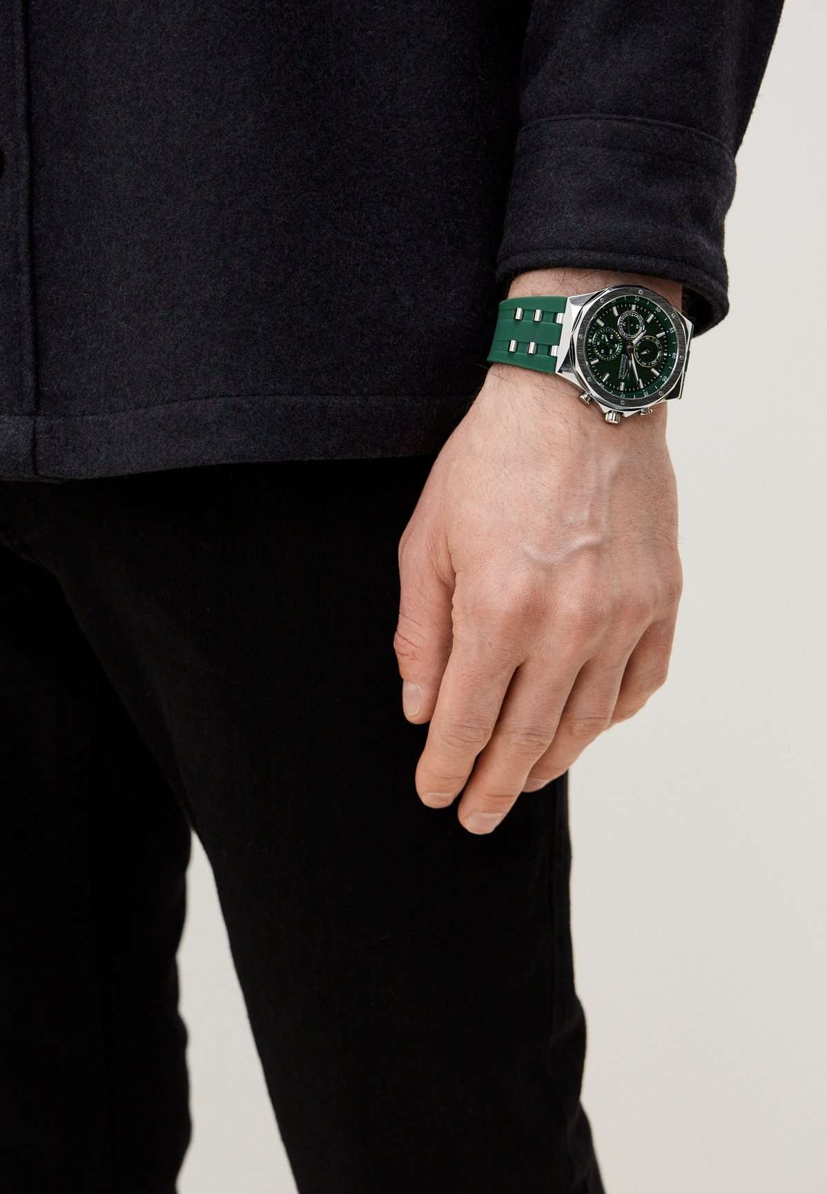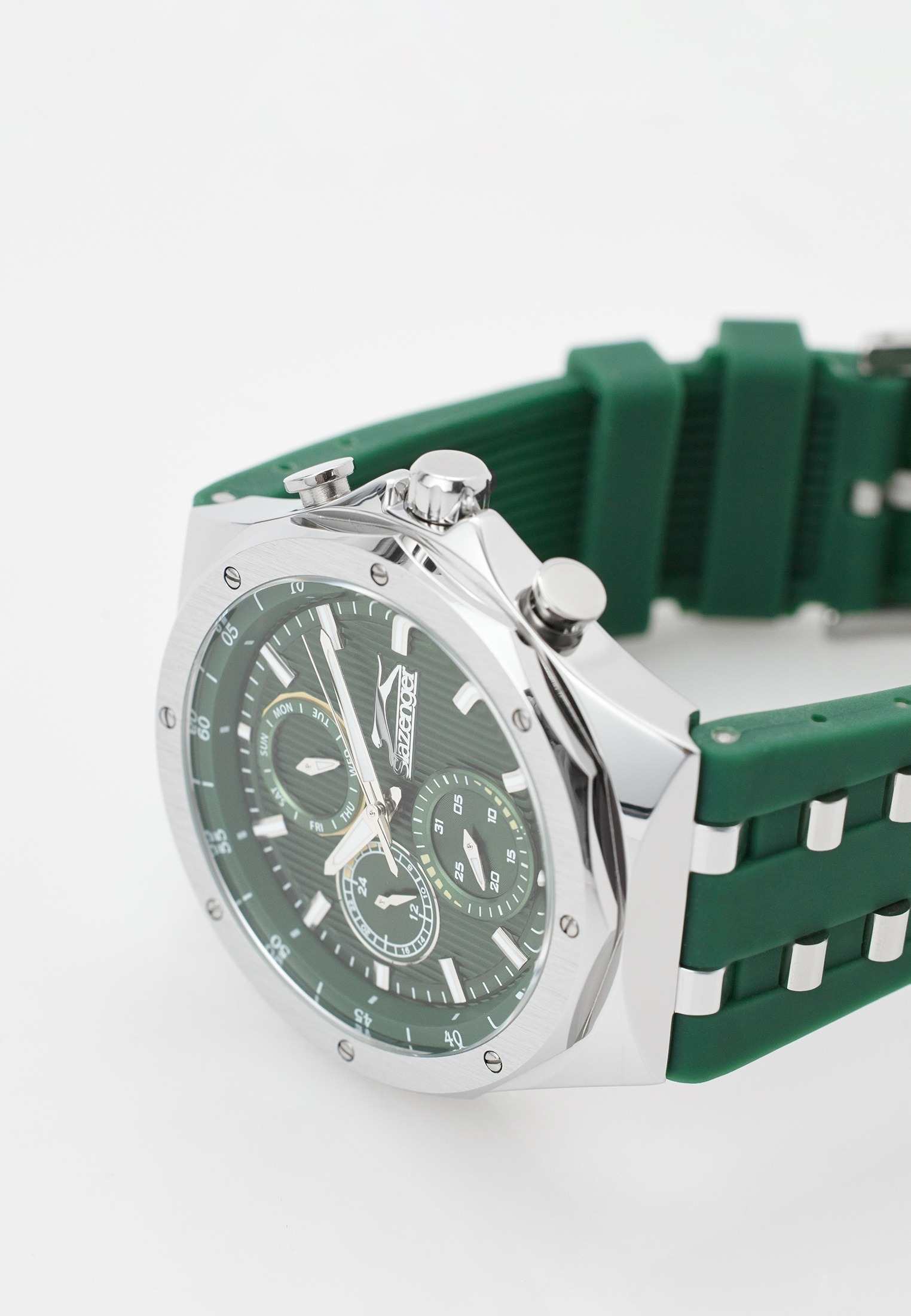 Мужские наручные часы Slazenger SL.09.2218.2.02 — идеальный аксессуар для тех, кто ценит стиль и функциональность. Эти часы, созданные известным британским брендом, отличаются высоким качеством и надежностью. Оснащенные кварцевым механизмом, они гарантируют точность хода и долгий срок службы. Корпус часов выполнен из прочного металла, а зеленый циферблат защищен минеральным стекломМинеральное стеклоМинеральное стекло представляет собой искусственно выращенный минерал кварца. Такое стекло отличается особой устойчивостью к повреждениям и царапинам. Уступает по некоторым качествам сапфировому стеклу., устойчивым к царапинам и повреждениям. Зеленый резиновый ремешок с металлическими вставками и классической застежкой обеспечивает комфортное ношение и надежную фиксацию на запястье. Диаметр корпуса составляет 46 мм, а толщина — 12 мм, что придает часам современный и стильный вид. Благодаря водозащите уровня WR 50, вы можете не беспокоиться о случайных попаданиях влаги, что делает эти часы идеальными для повседневного использования. Стрелки снабжены люминесцентным покрытиемЛюминесцентное покрытиеПозволяет считывать показания времени в темноте. Производители наносят на стрелки, часовые индексы, безель или поверхность циферблата светонакопительный состав, дающий холодное свечение., что позволяет легко считывать время в темноте. Функциональность модели включает в себя отображение даты, дня недели и времени в 24-часовом формате на дополнительных малых циферблатах, что делает часы не только стильными, но и практичными.