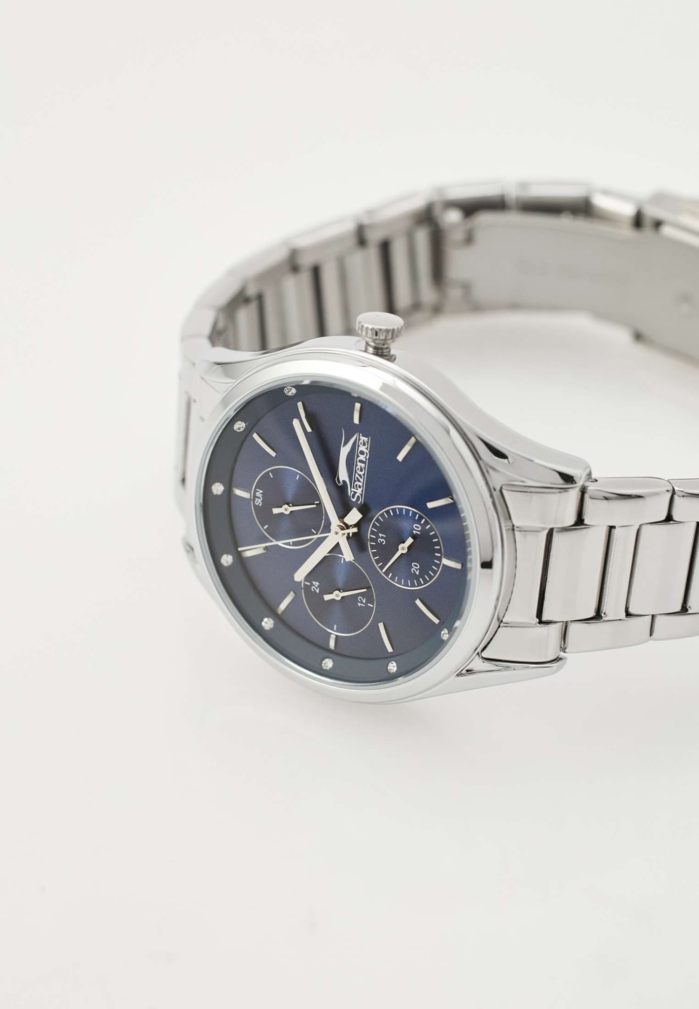 Часы Slazenger SL.09.2229.4.04 — это стильная и элегантная модель, созданная для современных женщин, ценящих изысканный дизайн и функциональность. Корпус и браслет выполнены из прочного металла серебристого цвета, что придает аксессуару особую утонченность. Синий циферблат украшен мерцающими кристаллами, а также оснащён дополнительными малыми циферблатами, которые отображают дату, день недели и время в 24-часовом формате. Минеральное стеклоМинеральное стеклоМинеральное стекло представляет собой искусственно выращенный минерал кварца. Такое стекло отличается особой устойчивостью к повреждениям и царапинам. Уступает по некоторым качествам сапфировому стеклу. надежно защищает часы от царапин, а водозащита уровня WR 30 позволяет не беспокоиться о случайном попадании влаги. Металлический браслет снабжён удобной раскладной застёжкойРаскладная застёжкаТакой тип застёжки используется только на браслетах из металла. Она никогда не раскрывается полностью, происходит разделение на 2 и более частей. Раскладывающая застёжка снизит вероятность потери часов к минимуму.. Диаметр корпуса составляет 36 мм, толщина — 9 мм, а вес — 82 грамма, что обеспечивает комфортное ношение в течение всего дня. Часы оснащены кварцевым механизмом.