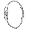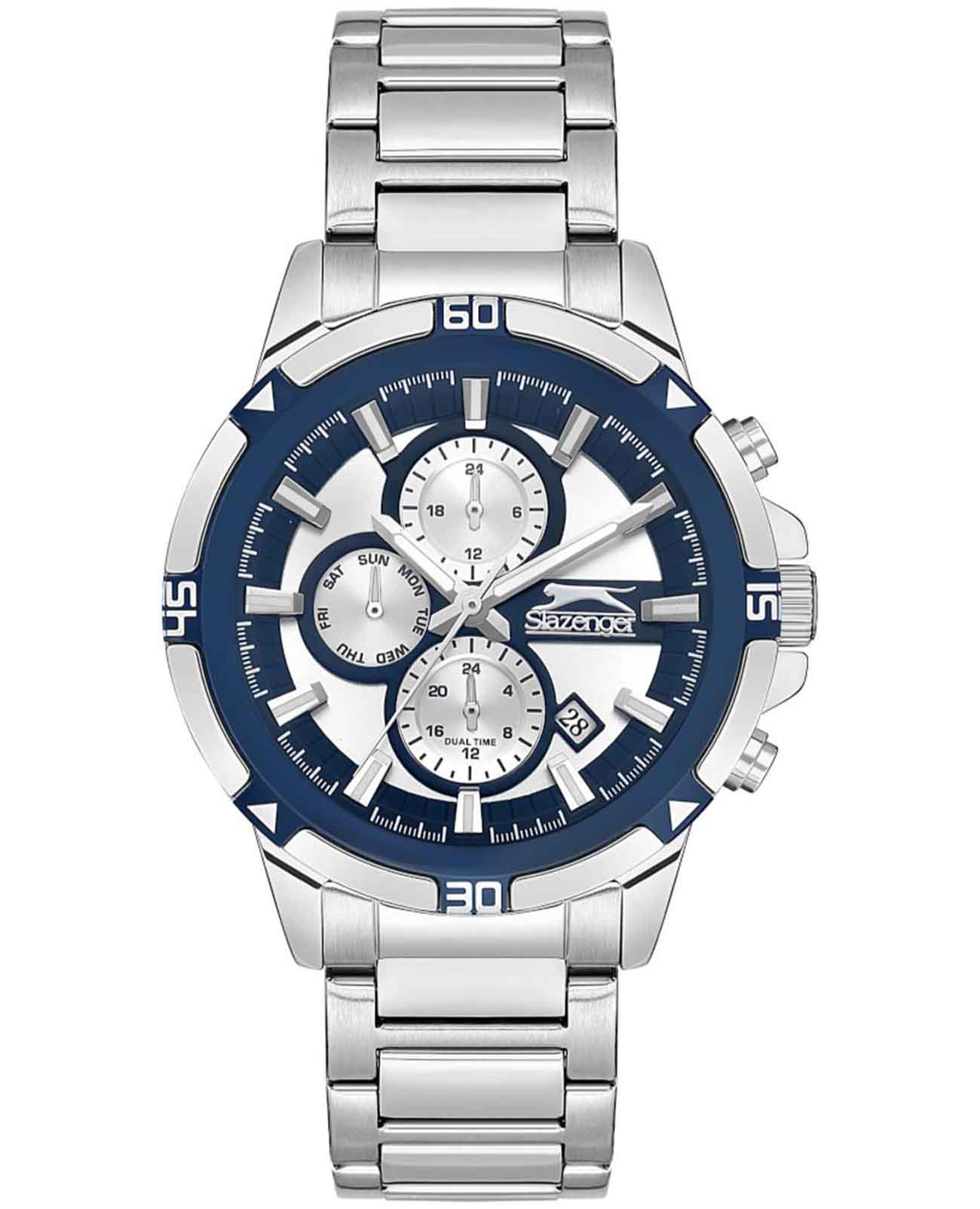 Часы Slazenger SL.09.2249.2.02 — это стильная и практичная модель, выполненная в элегантном серебристом цвете. Корпус и браслет изготовлены из металла, что обеспечивает прочность и долговечность. На безельБезельВнешний ободок, закрепляющий стекло. В спортивных часах так называется поворотное кольцо с делениями на циферблате, выполняет роль таймера – замеряет отрезки времени на шкале. Неподвижный безель – элемент декора. Однонаправленно вращающийся безель на дайверских часах позволяет фиксировать моменты погружения и выныривания на поверхность. частично нанесено синее IP-покрытиеIP-покрытиеМетод ионного напыления. Демонстрирует повышенную устойчивость к истиранию, окислению и химическим веществам. Под воздействием высокого давления и температуры около 1500°C молекулы металла надёжно соединяются с частицами корпуса часов.. Минеральное стеклоМинеральное стеклоМинеральное стекло представляет собой искусственно выращенный минерал кварца. Такое стекло отличается особой устойчивостью к повреждениям и царапинам. Уступает по некоторым качествам сапфировому стеклу. надежно защищает сине-серебристый циферблат от царапин и повреждений. Диаметр корпуса составляет 45 мм, а толщина — 12 мм, благодаря чему часы смотрятся солидно и современно. Модель оснащена кварцевым механизмом, отличающимся точностью и надежностью. На циферблате представлены дополнительные малые циферблаты для отображения второго часового поясаВторой часовой поясФункция, позволяющая отображать время двух часовых поясов одновременно., дня недели и времени в 24-часовом формате, а также имеется отдельное окошко даты. Для удобства использования в темное время суток предусмотрено люминесцентное покрытиеЛюминесцентное покрытиеПозволяет считывать показания времени в темноте. Производители наносят на стрелки, часовые индексы, безель или поверхность циферблата светонакопительный состав, дающий холодное свечение. стрелок и меток. Удобный металлический браслет шириной 22 мм снабжен раскладной застёжкойРаскладная застёжкаТакой тип застёжки используется только на браслетах из металла. Она никогда не раскрывается полностью, происходит разделение на 2 и более частей. Раскладывающая застёжка снизит вероятность потери часов к минимуму., обеспечивающей надежную фиксацию на запястье. Заводная головка оснащена защитой. Водозащита уровня WR 50 позволяет не снимать часы при мытье рук или попадании под дождь. Вес модели составляет 151 грамм.