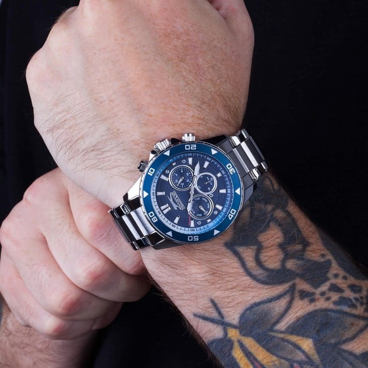 Часы Slazenger SL.09.2250.2.03 — это стильная и практичная модель, выполненная в элегантном серебристом цвете. Корпус и браслет изготовлены из металла, что обеспечивает прочность и долговечность. На безельБезельВнешний ободок, закрепляющий стекло. В спортивных часах так называется поворотное кольцо с делениями на циферблате, выполняет роль таймера – замеряет отрезки времени на шкале. Неподвижный безель – элемент декора. Однонаправленно вращающийся безель на дайверских часах позволяет фиксировать моменты погружения и выныривания на поверхность. нанесено синее IP-покрытиеIP-покрытиеМетод ионного напыления. Демонстрирует повышенную устойчивость к истиранию, окислению и химическим веществам. Под воздействием высокого давления и температуры около 1500°C молекулы металла надёжно соединяются с частицами корпуса часов.. Минеральное стеклоМинеральное стеклоМинеральное стекло представляет собой искусственно выращенный минерал кварца. Такое стекло отличается особой устойчивостью к повреждениям и царапинам. Уступает по некоторым качествам сапфировому стеклу. надежно защищает синий циферблат от царапин и повреждений. Диаметр корпуса составляет 44 мм, а толщина — 11 мм, благодаря чему часы смотрятся солидно и современно. Модель оснащена кварцевым механизмом, отличающимся точностью и надежностью. На циферблате представлены дополнительные малые циферблаты для отображения второго часового поясаВторой часовой поясФункция, позволяющая отображать время двух часовых поясов одновременно., дня недели и времени в 24-часовом формате, а также имеется отдельное окошко даты. Для удобства использования в темное время суток предусмотрено люминесцентное покрытиеЛюминесцентное покрытиеПозволяет считывать показания времени в темноте. Производители наносят на стрелки, часовые индексы, безель или поверхность циферблата светонакопительный состав, дающий холодное свечение. стрелок и меток. Удобный металлический браслет шириной 22 мм снабжен раскладной застёжкойРаскладная застёжкаТакой тип застёжки используется только на браслетах из металла. Она никогда не раскрывается полностью, происходит разделение на 2 и более частей. Раскладывающая застёжка снизит вероятность потери часов к минимуму., обеспечивающей надежную фиксацию на запястье. Заводная головка оснащена защитой. Водозащита уровня WR 50 позволяет не снимать часы при мытье рук или попадании под дождь. Вес модели составляет 152 грамм.