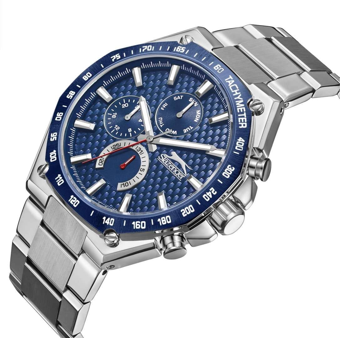 Мужские кварцевые часы Slazenger SL.09.2325.2.02 — это выразительный и функциональный аксессуар, сочетающий стиль, прочность и насыщенную комплектацию. Корпус и браслет выполнены из суперметалла, а циферблат оформлен в синих тонах. Циферблат защищён минеральным стекломМинеральное стеклоМинеральное стекло представляет собой искусственно выращенный минерал кварца. Такое стекло отличается особой устойчивостью к повреждениям и царапинам. Уступает по некоторым качествам сапфировому стеклу. и дополнен вынесенными малыми циферблатами для индикации дня недели, даты и времени в 24-часовом формате. БезельБезельВнешний ободок, закрепляющий стекло. В спортивных часах так называется поворотное кольцо с делениями на циферблате, выполняет роль таймера – замеряет отрезки времени на шкале. Неподвижный безель – элемент декора. Однонаправленно вращающийся безель на дайверских часах позволяет фиксировать моменты погружения и выныривания на поверхность. с IP-покрытиемIP-покрытиеМетод ионного напыления. Демонстрирует повышенную устойчивость к истиранию, окислению и химическим веществам. Под воздействием высокого давления и температуры около 1500°C молекулы металла надёжно соединяются с частицами корпуса часов. дополнен тахиметромТахиметрРазмеченная шкала, располагается на ободке или безеле часов. Тахиметр позволяет рассчитать скорость на определённом участке пути, расстояние измеряется в километрах или милях.. Стрелки и метки оснащены люминесцентным покрытиемЛюминесцентное покрытиеПозволяет считывать показания времени в темноте. Производители наносят на стрелки, часовые индексы, безель или поверхность циферблата светонакопительный состав, дающий холодное свечение., обеспечивающим хорошую читаемость в темноте. Браслет из суперметалла фиксируется на раскладной застёжкеРаскладная застёжкаТакой тип застёжки используется только на браслетах из металла. Она никогда не раскрывается полностью, происходит разделение на 2 и более частей. Раскладывающая застёжка снизит вероятность потери часов к минимуму., обеспечивая удобство и безопасность ношения. Водонепроницаемость 50 м позволяет использовать часы в повседневных условиях, защищая от случайных брызг и капель дождя. Модель подчёркивает индивидуальность владельца и идеально подходит как для повседневного, так и для делового образа.